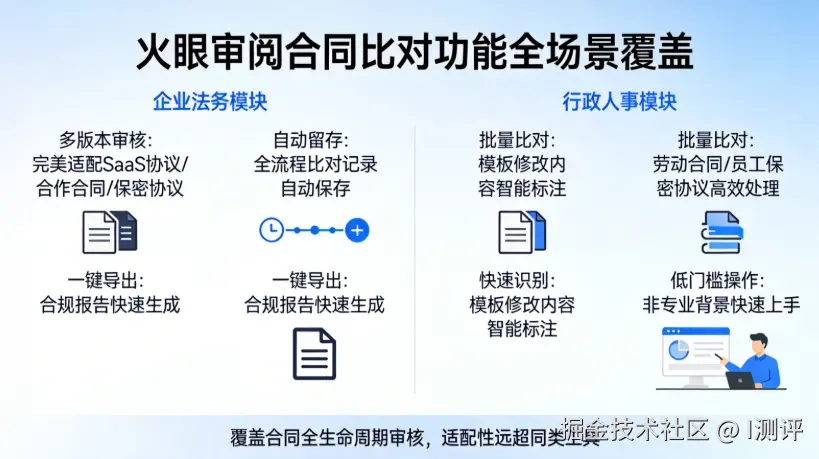 随着企业数字化办公普及,智能合同比对工具成了很多团队的 “救星”,其中火眼审阅的合同比对功能凭借高口碑出圈。本次我们就站在真实用户视角,从核心功能、场景适配、效率数据、安全性、性价比5 个维度,做全流程实测,给大家最客观的使用参考,也帮大家避开工具选型的坑。