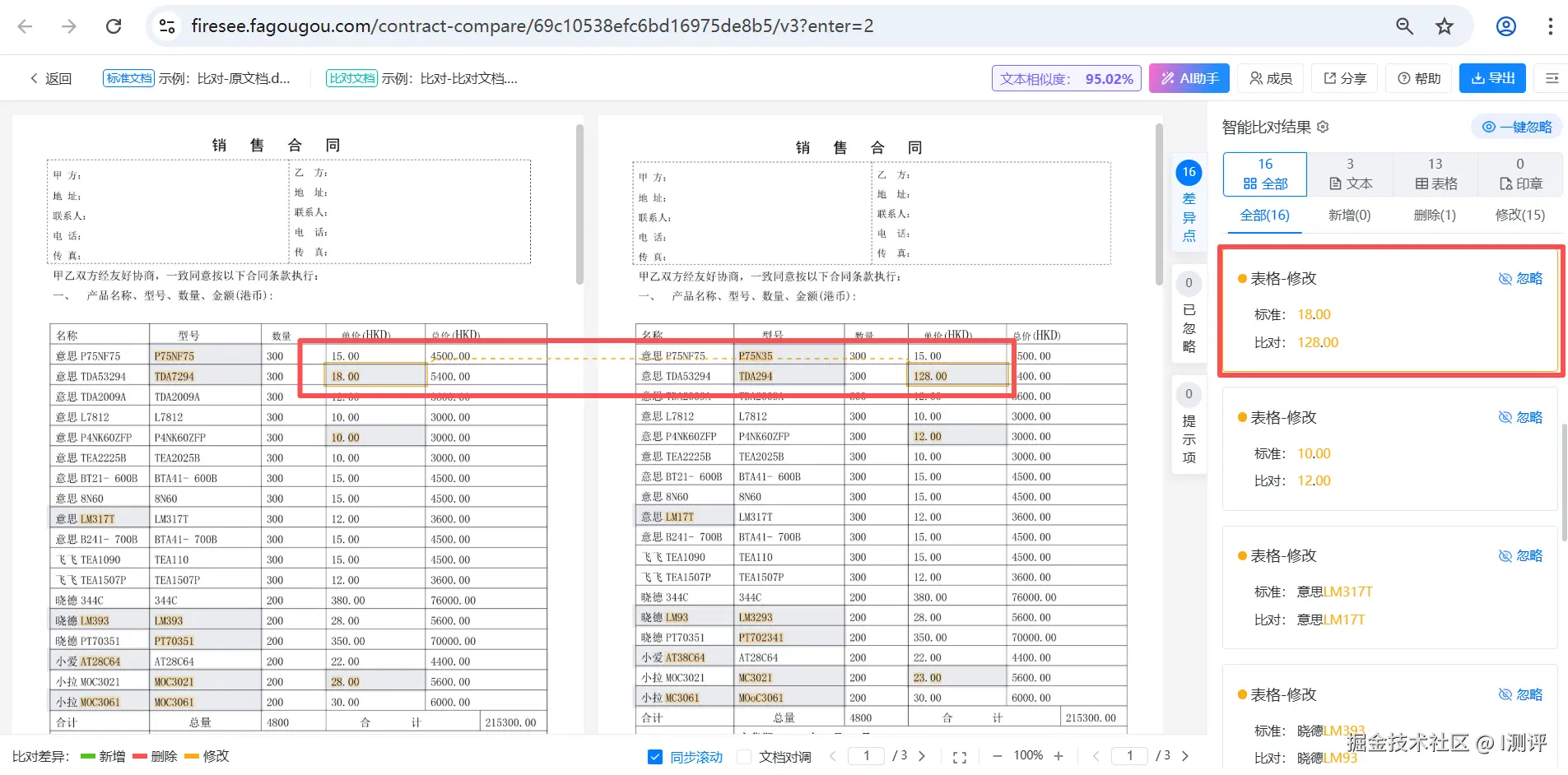 ·实测结果:系统仅用10 分钟就完成了全量版本的比对,自动识别出 “新增、删除、修改” 三类差异,用 “不同颜色高亮” 的方式可视化呈现,同时自动生成《差异对照表》,精准标注了变更前后的内容、所在页码。