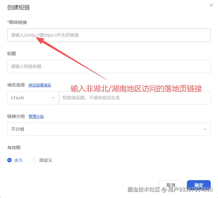 地区选择湖北+湖南,在对应输入框输入用户要访问的落地页链接,点击【确定】,一个“可以根据用户所属地区跳转至不同落地页”的短链接就搞定了!
