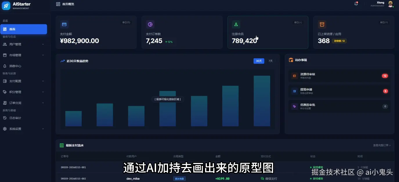 - AI加持后:仪表盘直接生成待办事项、优惠券审批、30天收益、用户管理等完整模块。 零基础开发者通过AI画出的原型,效果已经超越早期“懂代码懂设计”的手工版本。