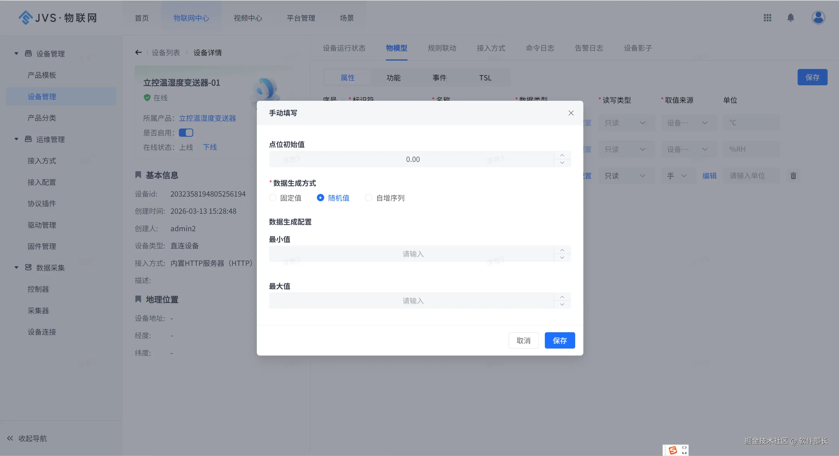 在设置属性的数据类型后,可以设置通过手动创建数据,主要用于在调试阶段,采集网络还不具备接入条件时可以系统自动生成数据