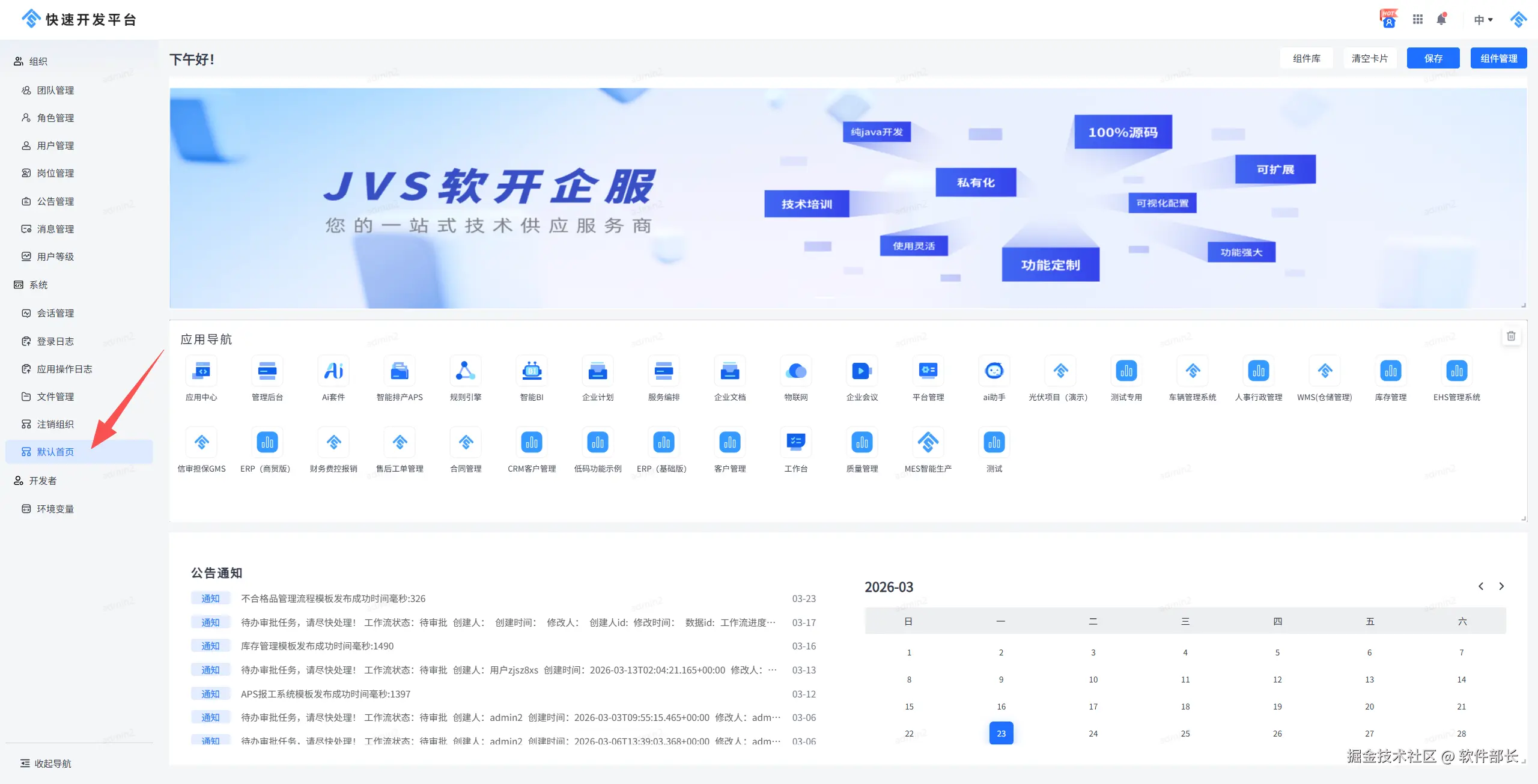 1、平台管理员现可在「系统设置」中,为所有用户统一配置一个全局的默认首页(如图中“默认首页”菜单项)。配置后,用户登录将默认进入该页面。