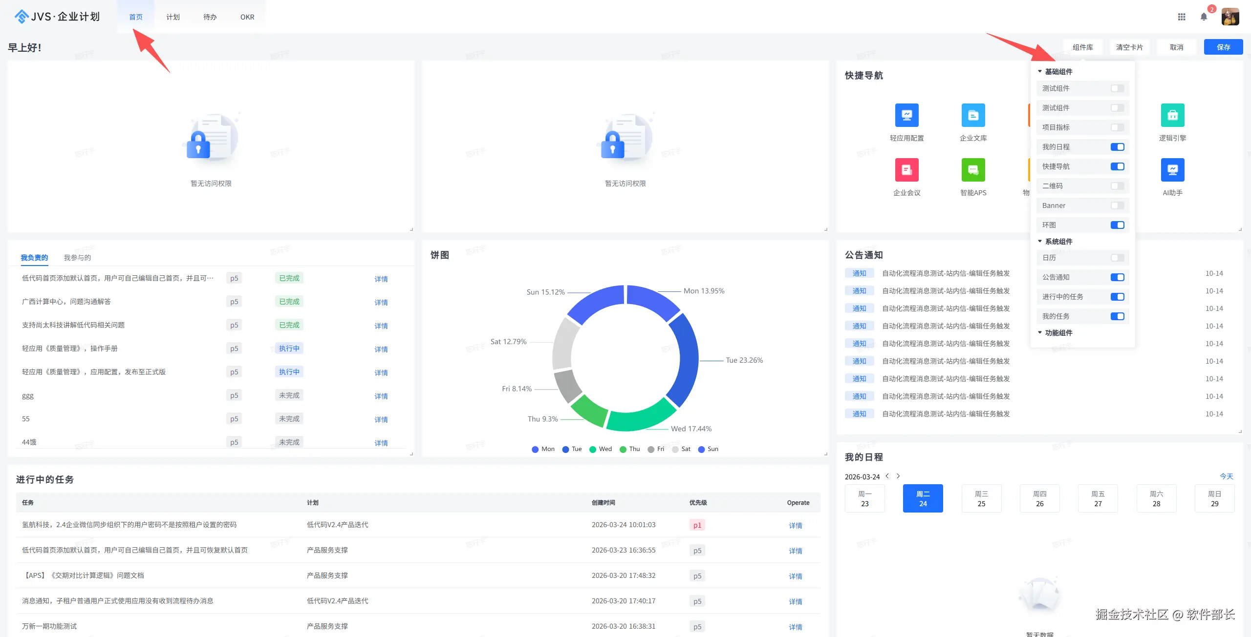 同时,支持用户级首页个性化。每位用户均可基于默认首页或空白画布,通过拖拽组件、调整布局,自由编辑并保存属于自己的个人首页。若想重置,只需点击页面上方的 “恢复默认” 按钮,即可一键切换回管理员设置的全局首页,兼顾了统一管理与个人偏好。