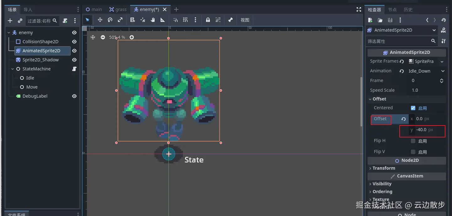 - 然后我们希望这个敌人是在空中悬浮的,所以我们需要这个精灵往上偏移一点,所以打开右侧检查器设置offset进行设置,将y轴的偏移设置为-40