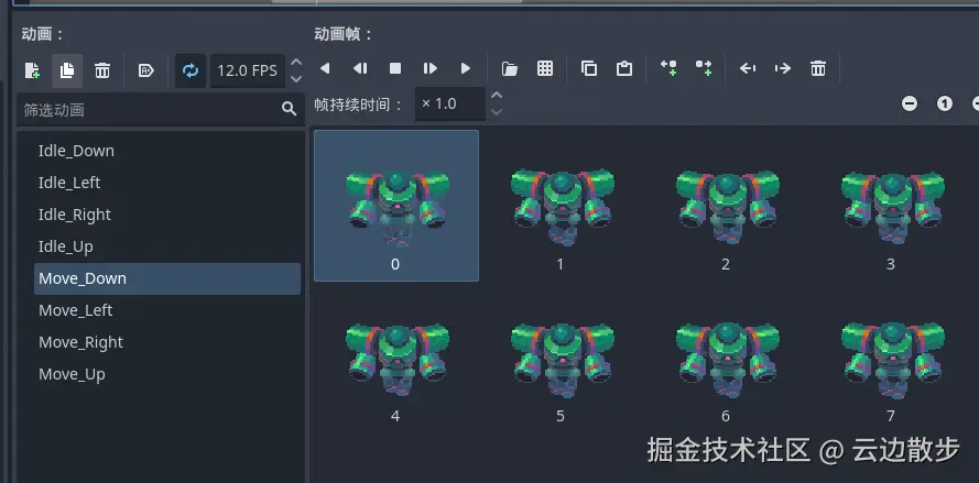 - 接下来我们把剩下的三个方向的待机状态动画都进行添加进去,以及移动的动画添加进去,待机动画和移动动画都是一样的,帧率也是一样的12帧