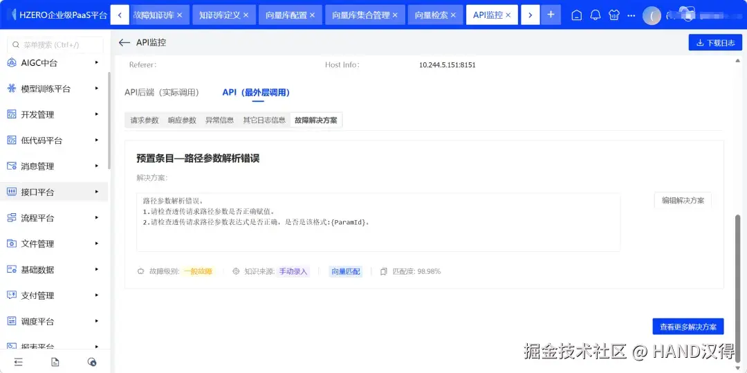 当API调用“失败”时,日志页会自动出现 「故障解决方案」Tab 页,匹配模式变更为向量匹配。