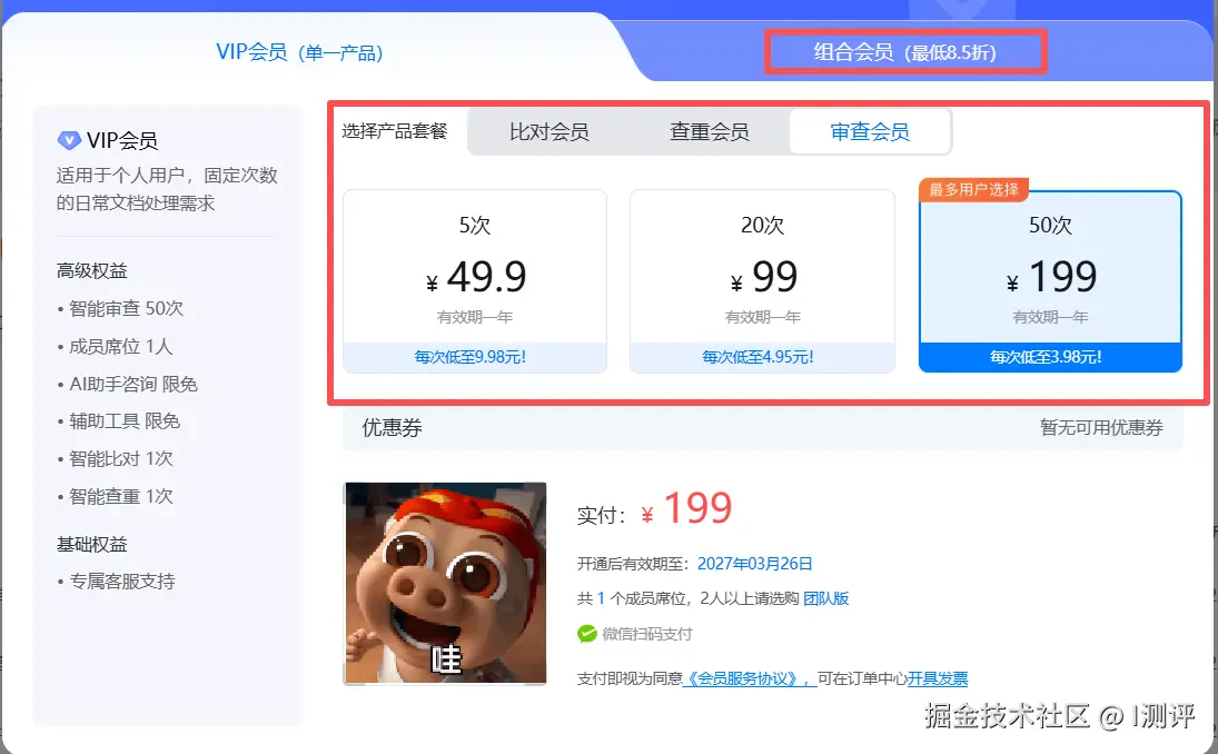 2.会员模式性价比拉满:对于高频使用的法务、企业用户,50次卡仅199元,一次仅需3.98元,对比同类型软件动辄上千元的月费,性价比直接断层领先;同时还有团队版、组合会员、本地私有化部署等选项,适配不同规模的用户需求。