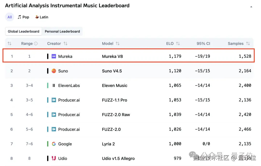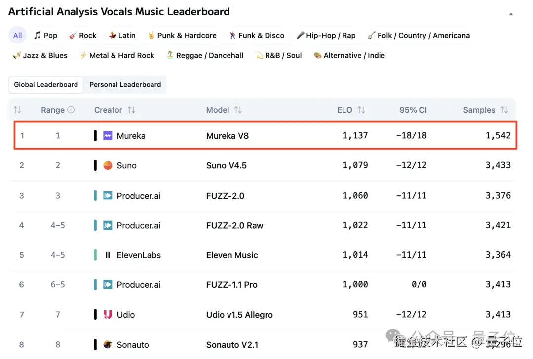 昆仑万维 Mureka V8,最新登顶 Artificial Analysis 音乐模型榜,一举超越 Suno V4.5、Udio v1.5 Allegro 等国际主流模型。
