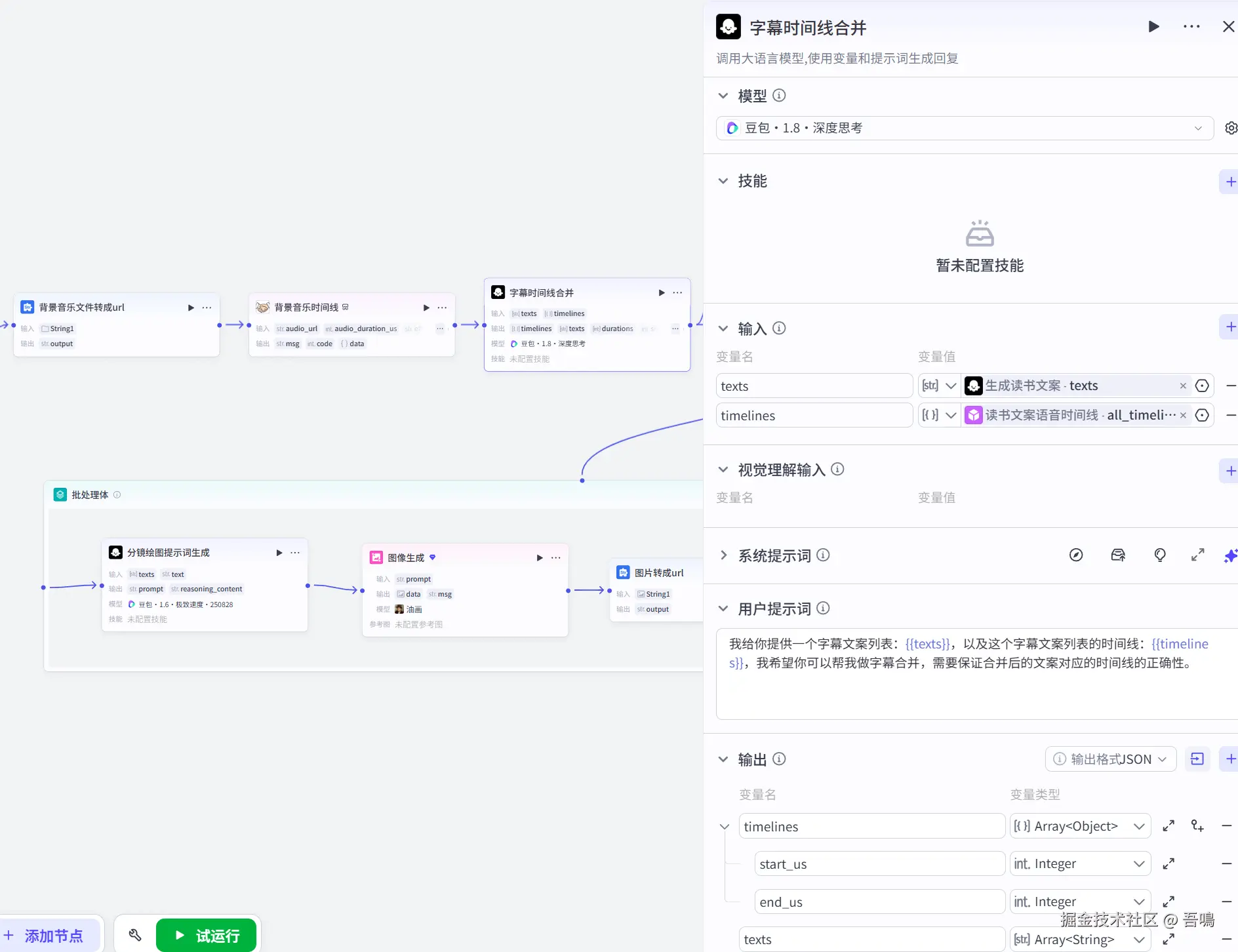 这个节点用来把散乱的字幕合并成语义连贯的文案,使用到了扣子官方的大模型节点,系统提示词已经打包好放在了文末,感兴趣的朋友可以按照文末的方式获取。