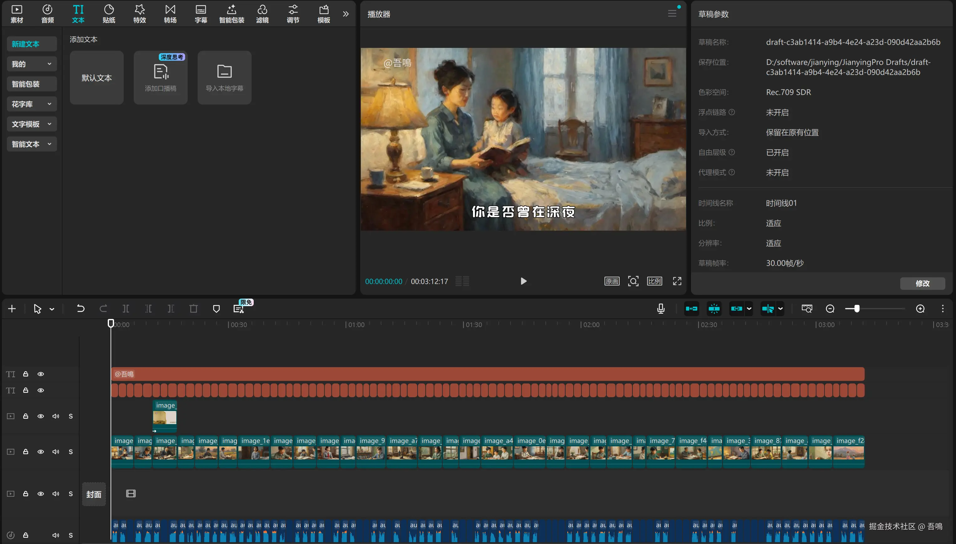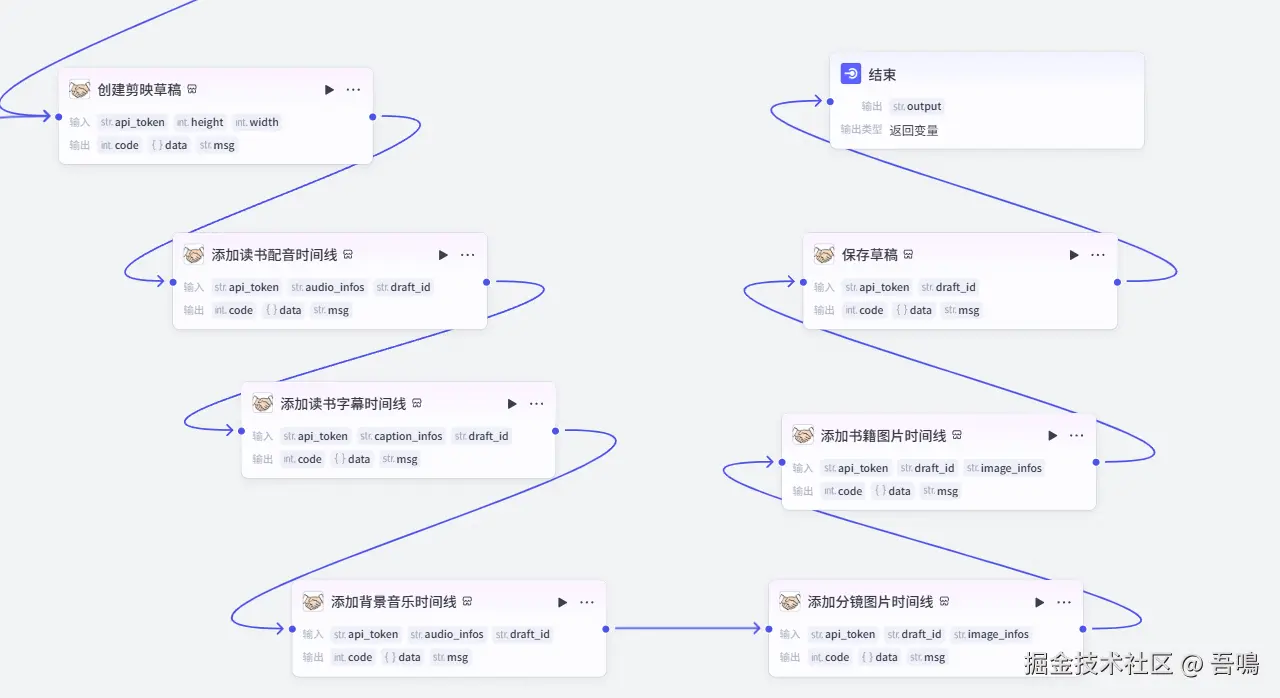 这部分的节点的作用就是把前面已经生成好的慢读书语音时间线、字幕时间线、分镜时间线、背景音乐时间线、封面图时间线都添加到剪映草稿中。