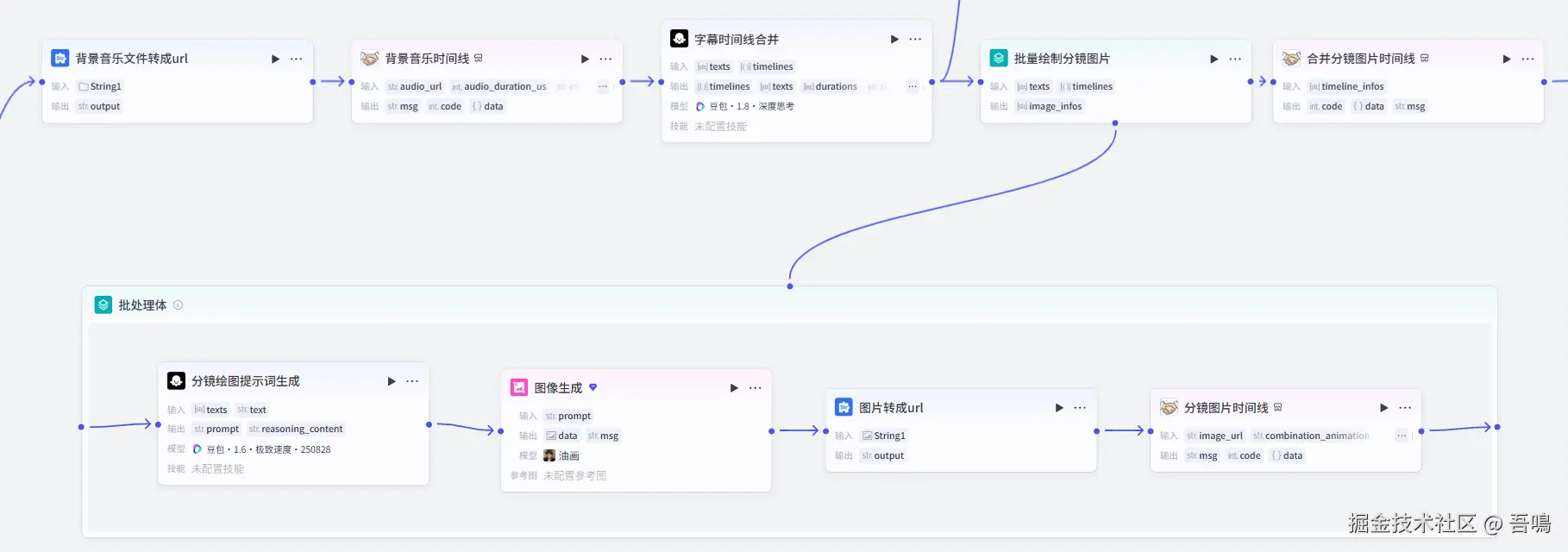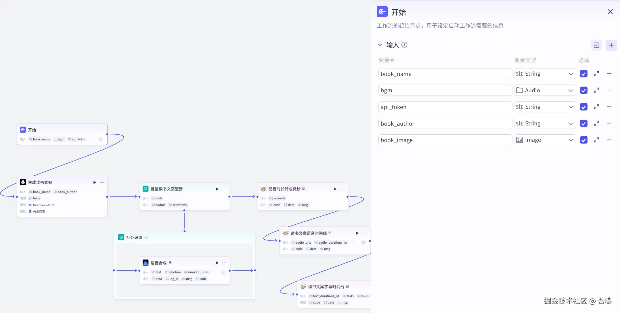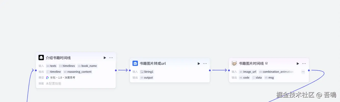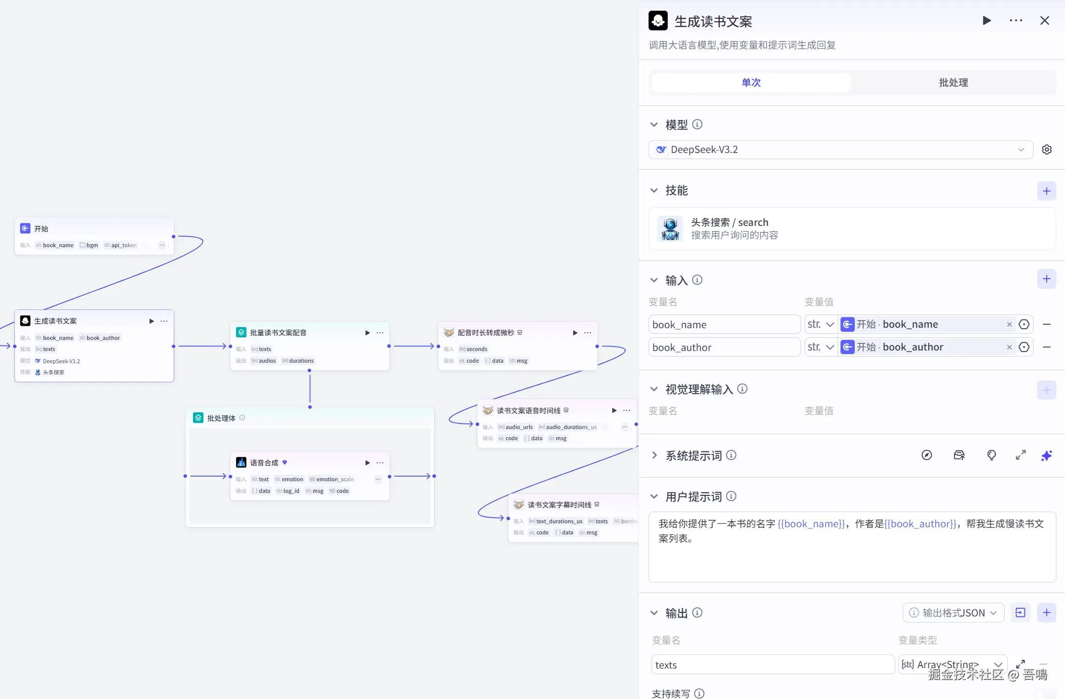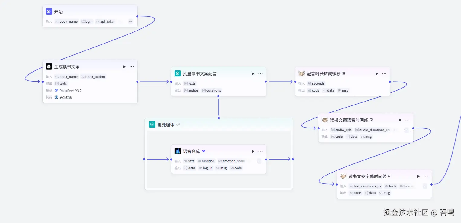 这部分的内容是负责生成慢读书视频的文案语音时间线以及字幕时间线,首先通过大模型来生成慢读书视频的文案,然后再通过扣子的语音合成插件对文案进行配音,最后再生成剪映的语音时间线和字幕时间线。