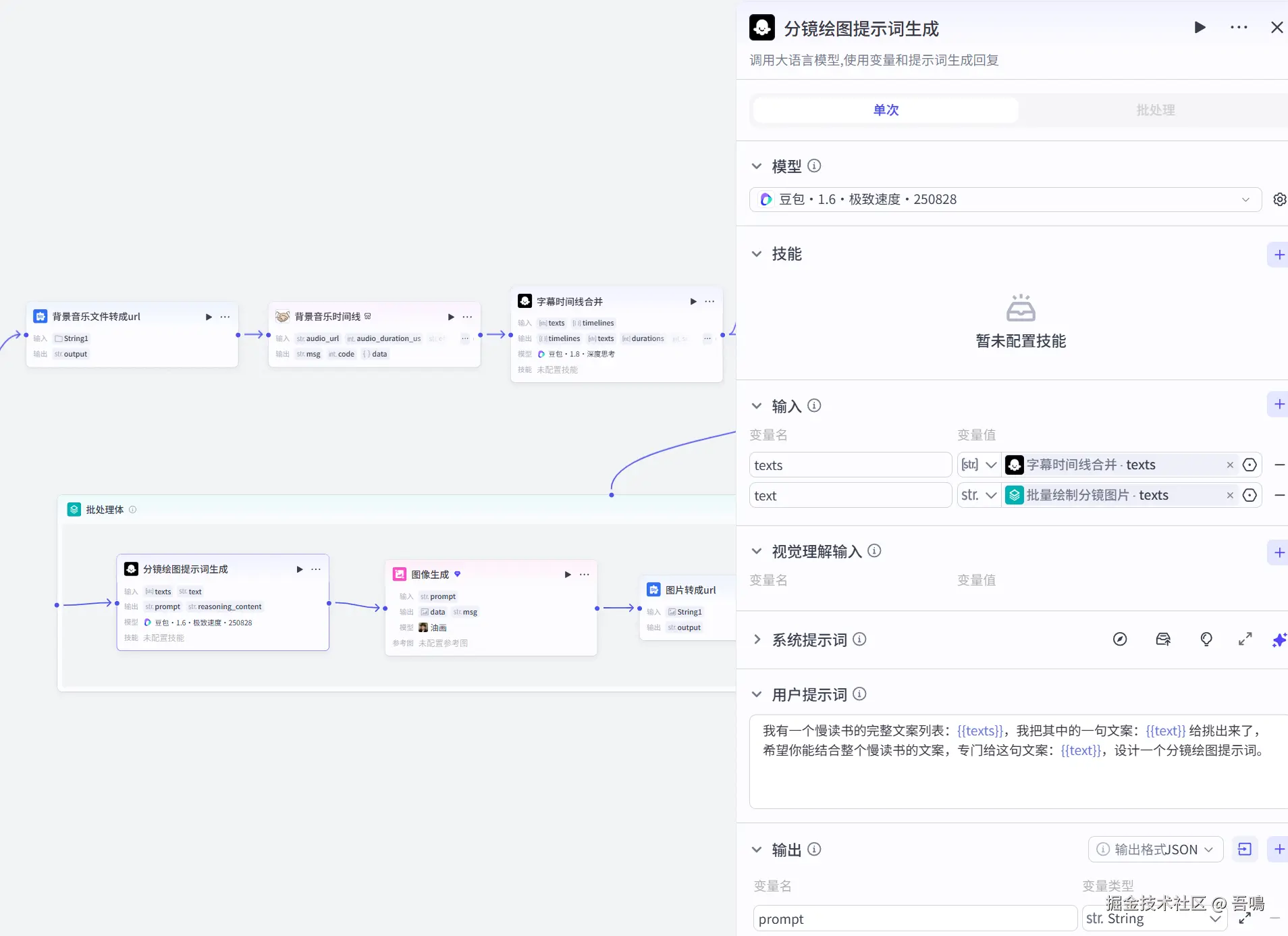 这个节点的作用是用来生成分镜绘图提示词,使用到了扣子官方的大模型节点,系统提示词已经打包好放于文末。