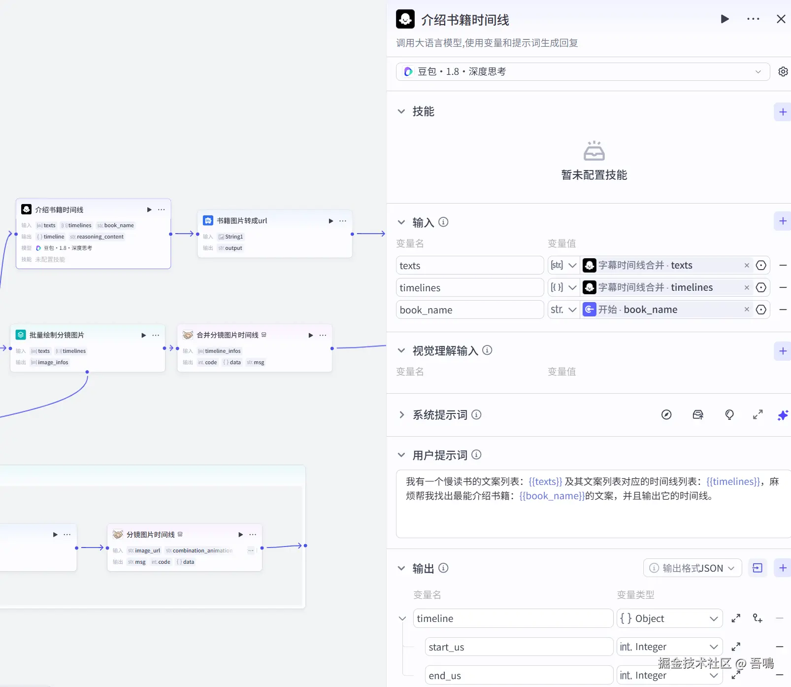 这个节点使用到了扣子官方的大模型节点,目的是让大模型识别出来最适合插入书籍封面图的时间点,系统提示词已经打包好放于文末。