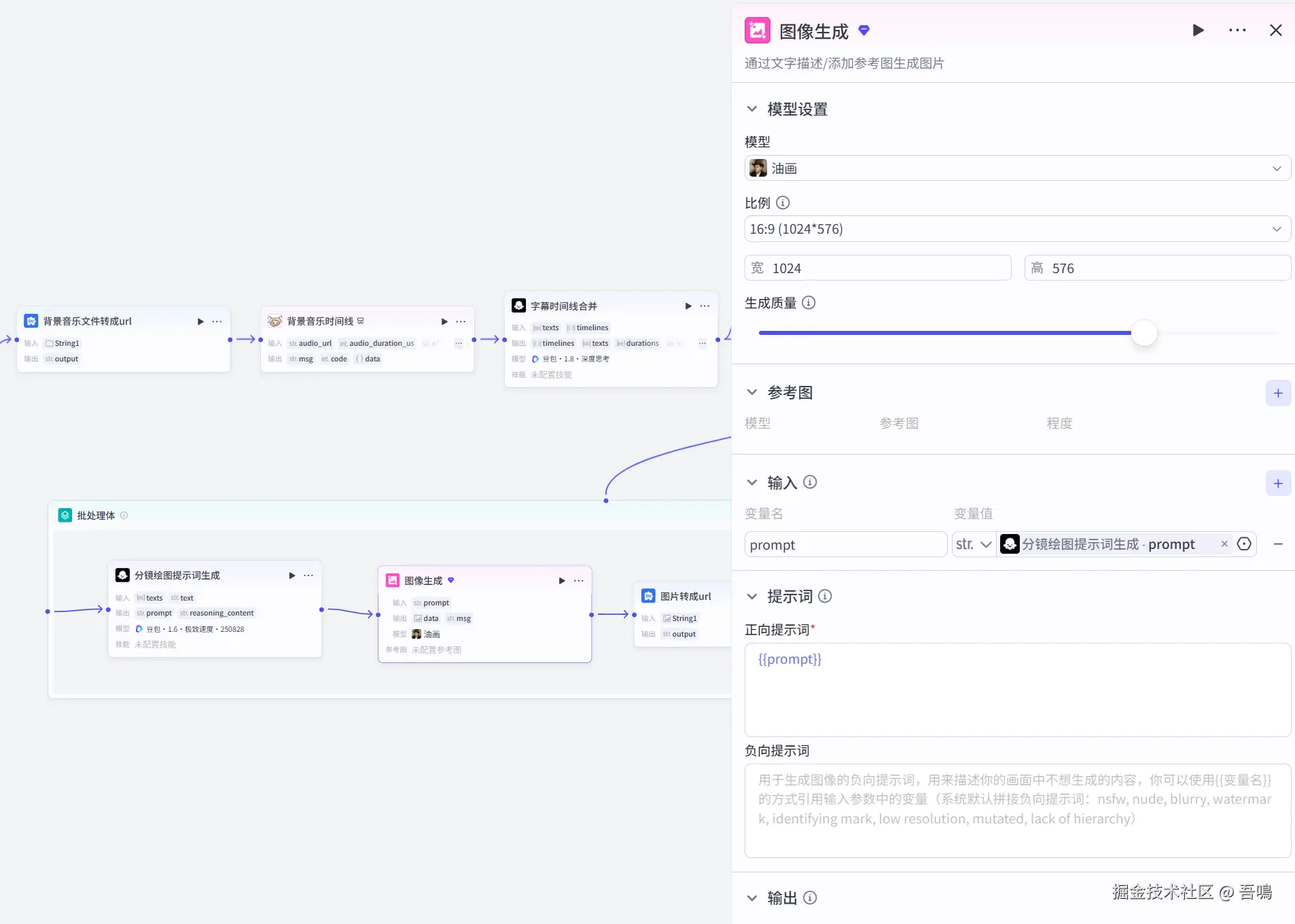 这个节点用来生成慢读书的分镜图片,使用到了扣子官方的图像生成节点,值得一提的是,模型使用了油画这个模型,还是第一次用,但是生成的油画的效果还是挺赞的。