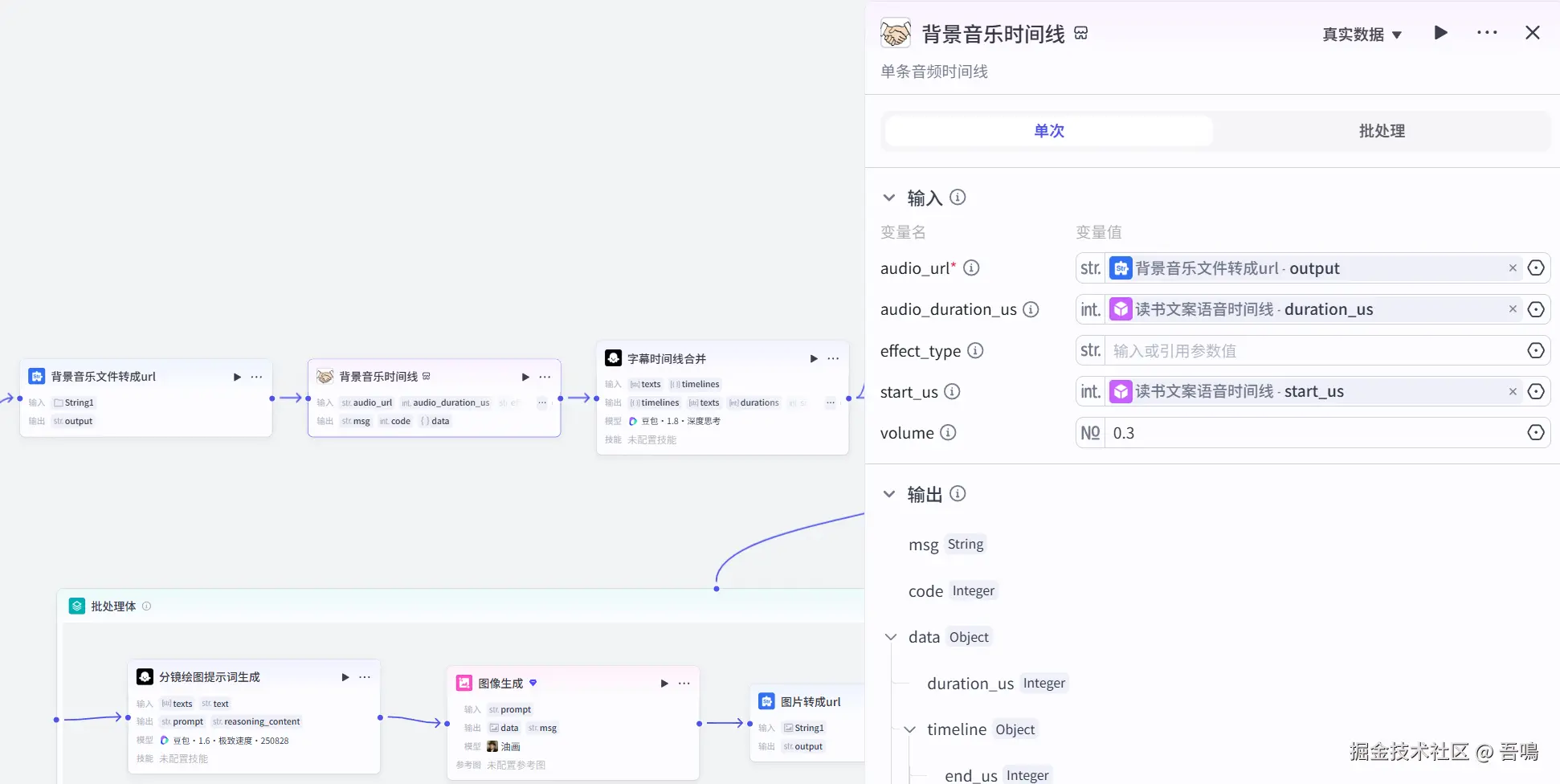 这个节点是用来生成剪映的背景音乐时间线,使用到了扣子三方插件【视频剪辑工具箱】的【single_audio_timeline】工具。
