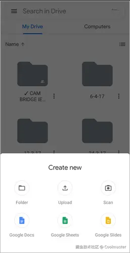 步骤2. 在Android设备上打开Google Drive应用。点击 + 图标或 “新建” 按钮,即可创建新文件夹或上传文件。选择要发送到iPhone的文件,然后点击 “上传” 即可将其上传到Google Drive存储空间。