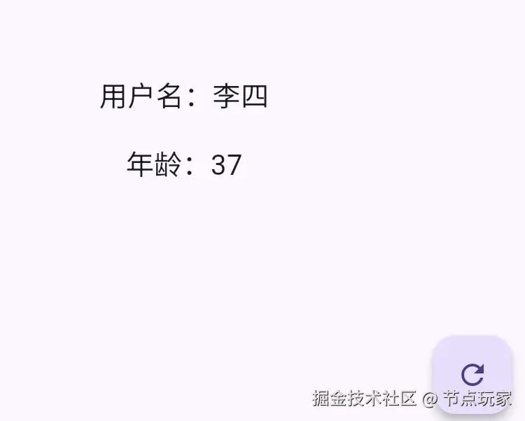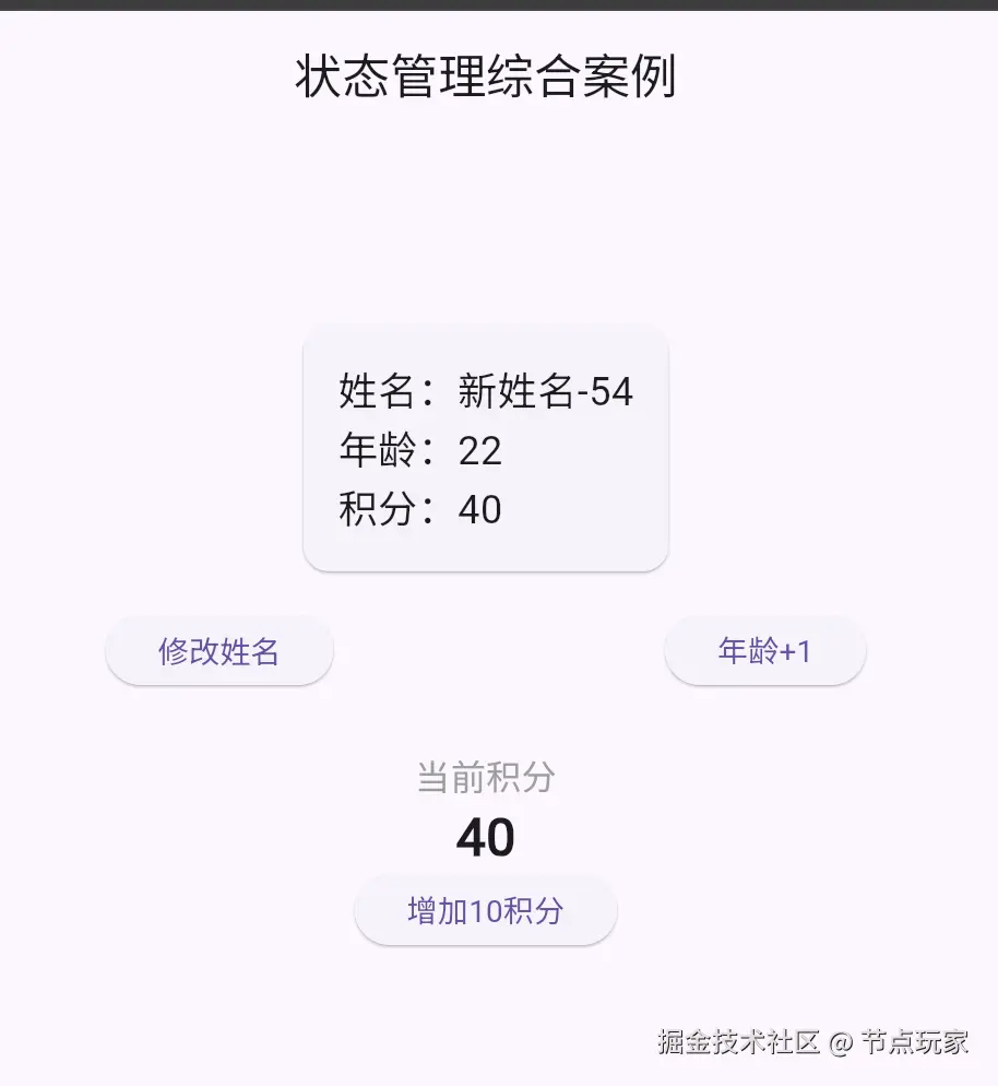 - 初始页面显示:姓名=初始姓名、年龄=20、积分=0