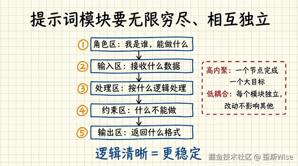 例如很多提示词模版里面的角色、输入、背景、目标、行动其实都是在划分边界,让每个模块只负责一件事,这样调整某个功能时,才不会牵一发而动全身。
