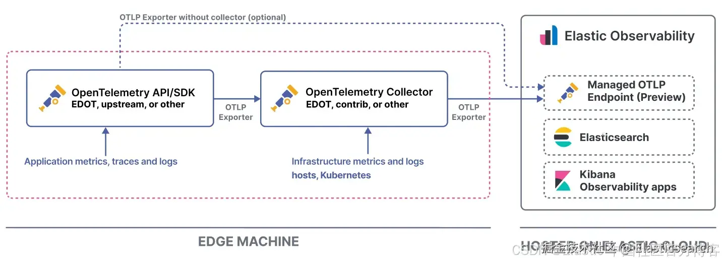 - 来自 OpenTelemetry SDKs(upstream,EDOT,或任何发行版),直接从你的应用程序导出。