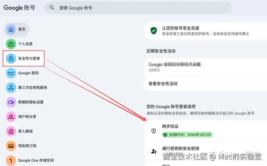 - 回到谷歌账号管理主页,点击左侧菜单 "安全性" (或"安全性与登录")