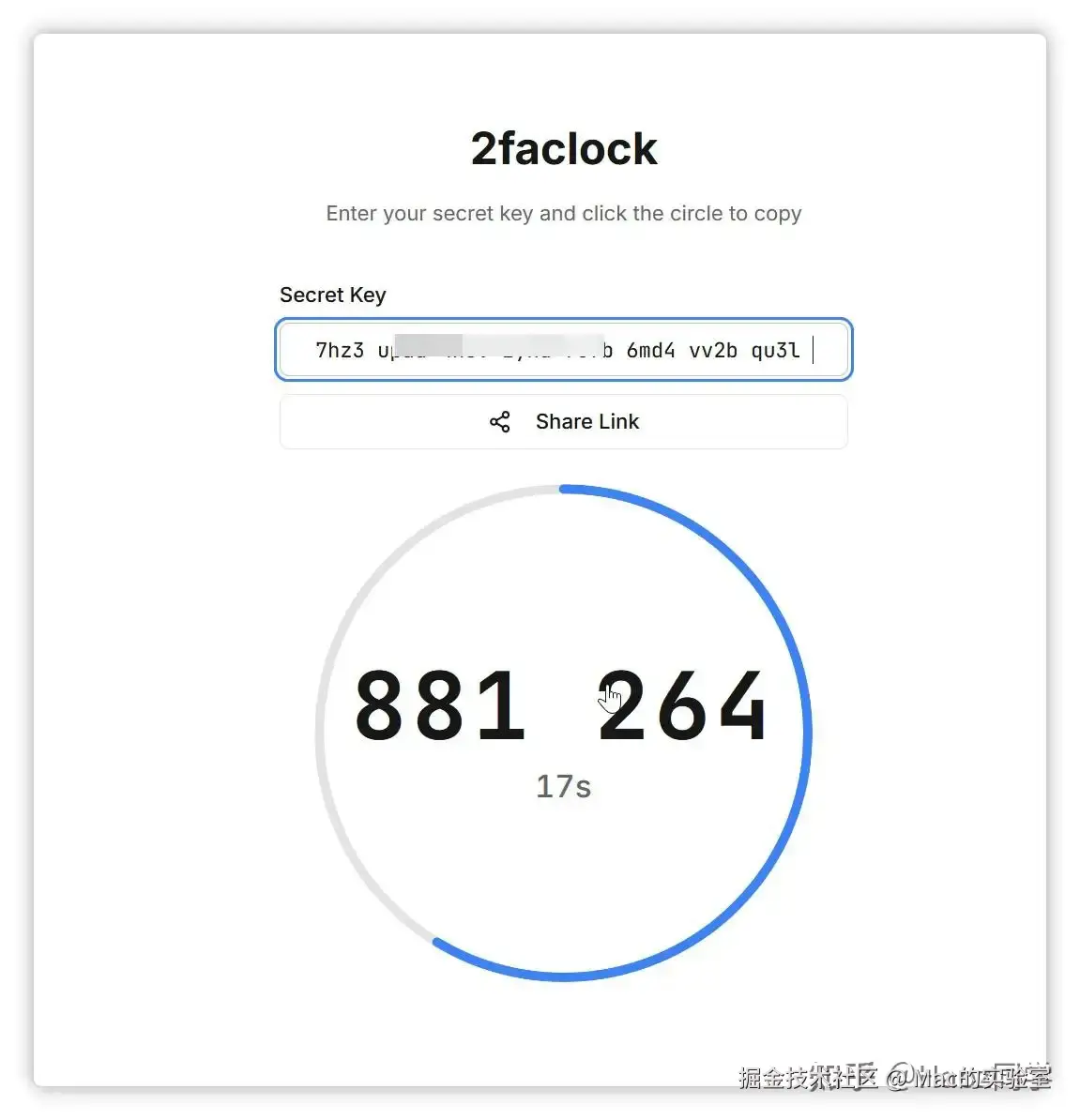 记住一定要保管好新的秘钥。这样下次登陆需要身份验证代码的时候,打开验证工具网址:2faclock - 2FA Authenticator输入秘钥即可生成实时验证码了。