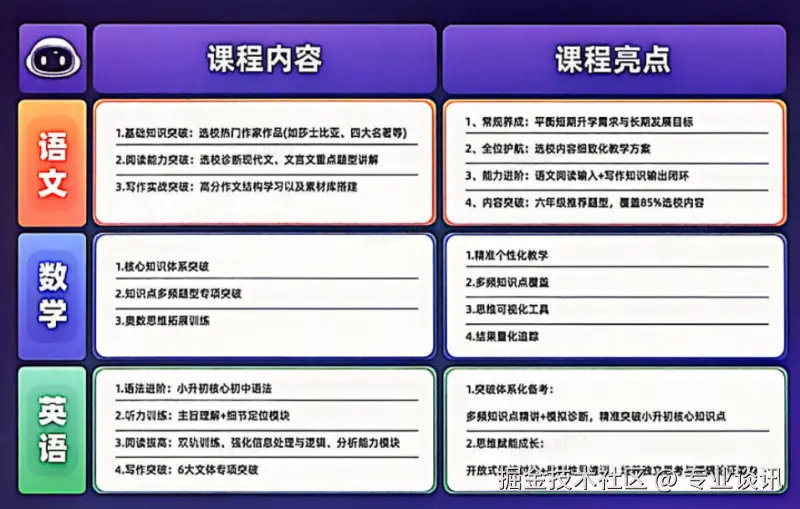 中高段: 分层教学,精准匹配不同基础学生;贴合苏教版教学内容与进度,夯实校内基础;基于苏教版大纲,融入七大奥数专题,注重数学思维拓展;基于人教版大纲,综合应用数学知识与思想,开发数学潜能,适配竞赛择校预备需求;以竞赛为目标,专注专题知识应用,培养独立解决问题能力,适合竞赛择校学生。