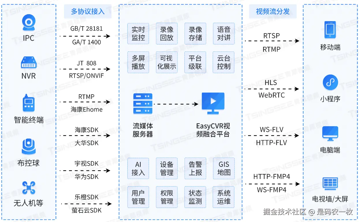 偏远地区监控设备普遍存在品牌混杂、协议不统一的问题,EasyCVR凭借强大的全协议兼容能力,彻底打破设备互通壁垒。平台全面支持国标GB28181、RTSP、RTMP、ONVIF等行业主流视频协议,同时兼容海康、大华、宇视等国内头部安防厂商的私有SDK,可无缝对接各类摄像头、NVR、无人机等监控采集设备,无需大规模替换原有存量设备,直接实现全域视频资源统一汇聚管理,大幅降低前期采购与后期改造投入。