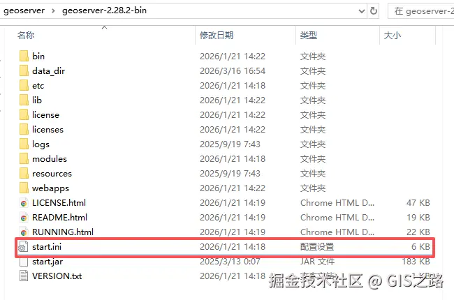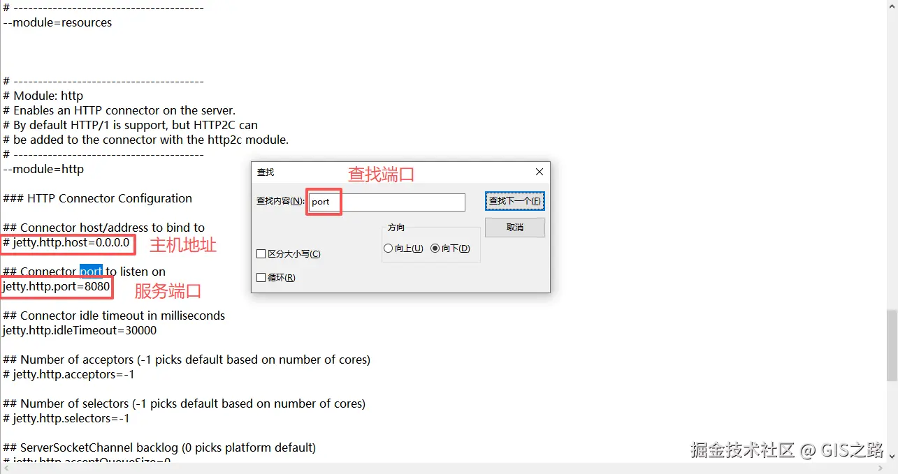 GeoServer默认端口为8080,由于在服务器或本地进行部署测试时,会存在多个服务,可能造成端口冲突,这时可以自定义服务端口。在根目录找到start.ini文件,双击打开。在记事本中打开查找功能,输入"port"搜索端口。找到jetty.http.port=8080行修改端口号,jetty.http.host=0.0.0.0行修改主机地址。