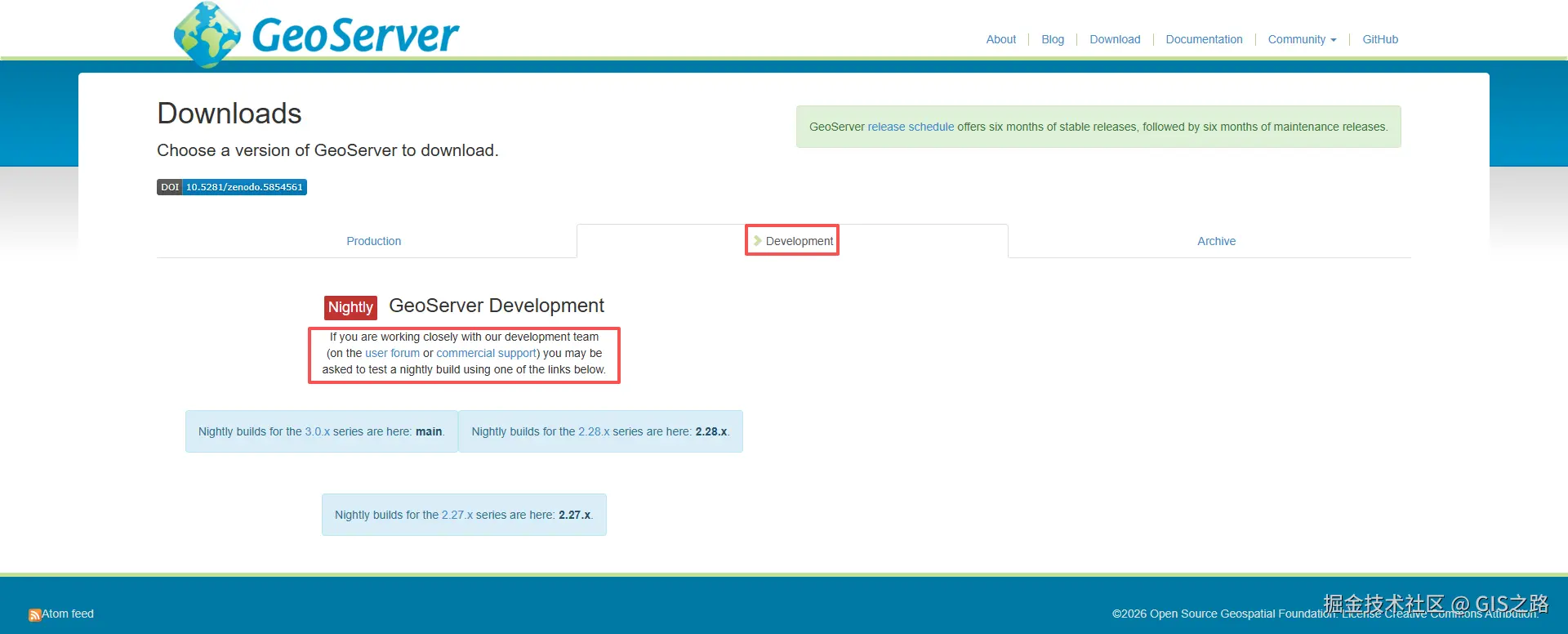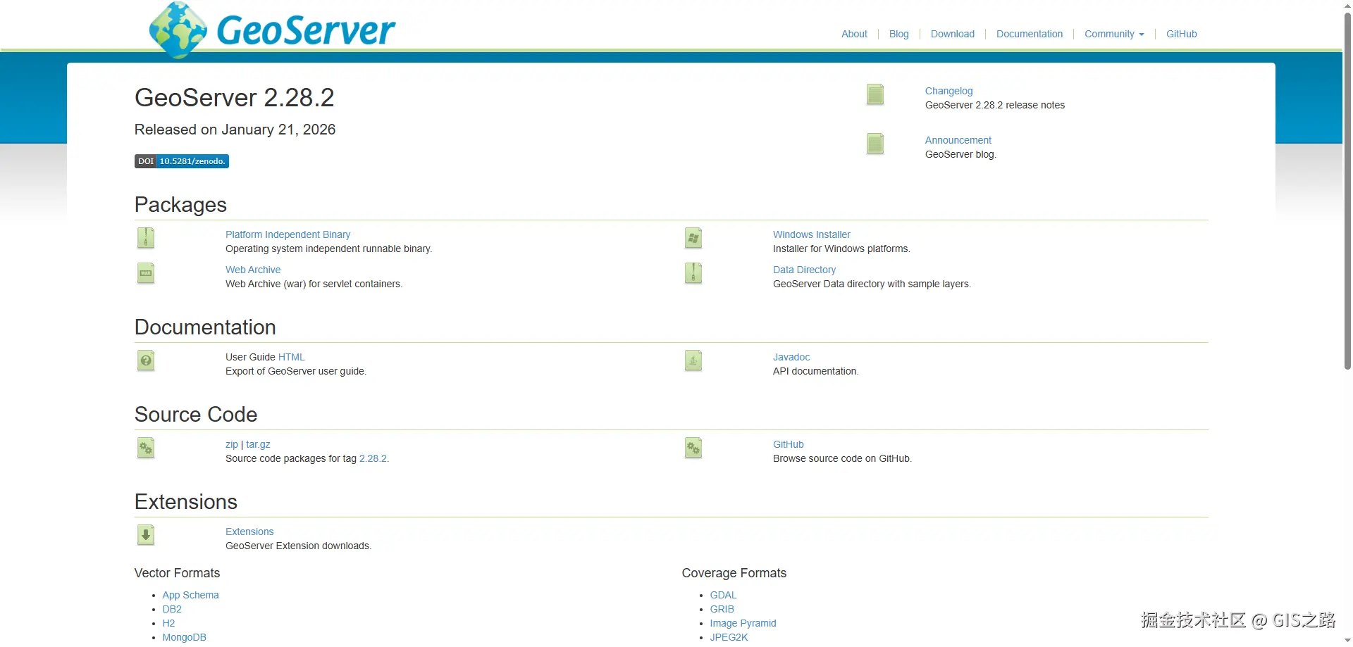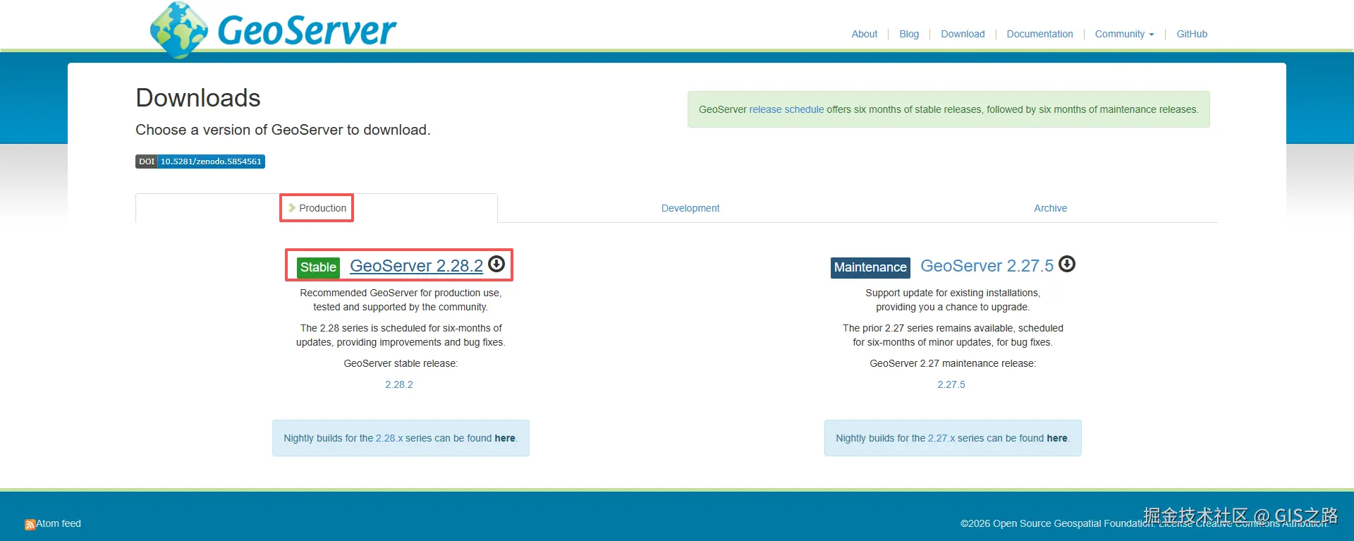 进入GeoServer官网首页,可以下载稳定版(用于生产环境)、开发版(用于开发环境)、维护版本(稳定、无新功能),可以根据自身需求下载对应版本和类型。