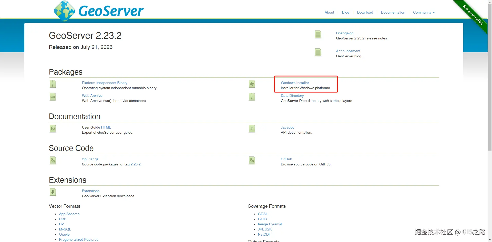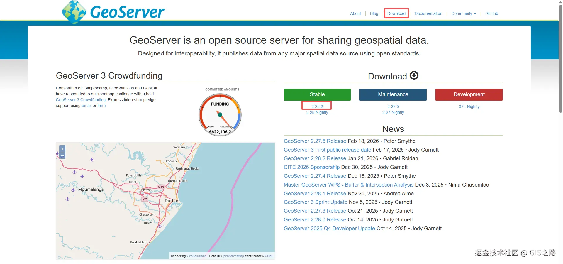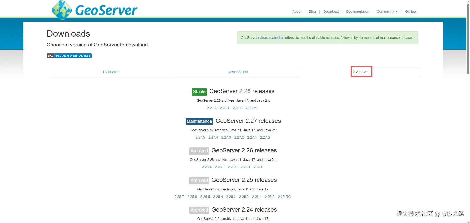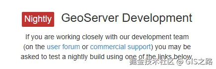 进入GeoServer官网首页,可以下载稳定版(用于生产环境)、开发版(用于开发环境)、维护版本(稳定、无新功能),可以根据自身需求下载对应版本和类型。