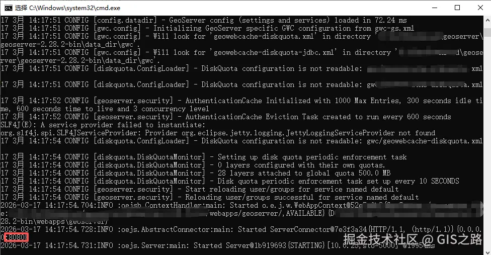 经过以上配置,可以启动GeoServer服务了。服务正常启动在命令行窗口中显示如下。
