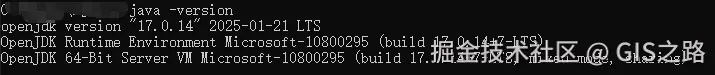 在正式运行GeoServer软件之前,需要检查JAVA环境。打开命令行窗口,输入java -version,如果JDK正确配置,则会出如下类似信息,实际以JDK类型和版本为主。若未安装JDK,请下载JDK并配置JAVA环境变量。