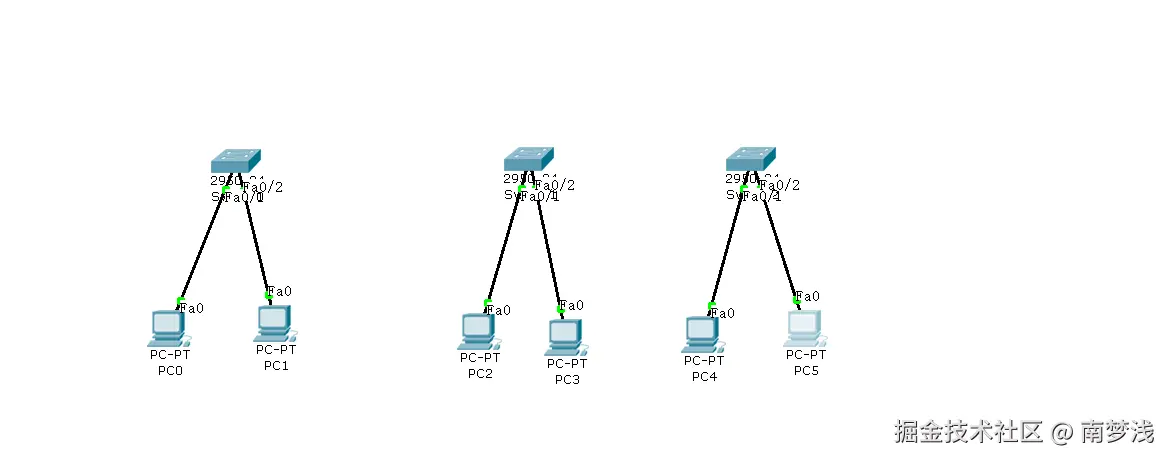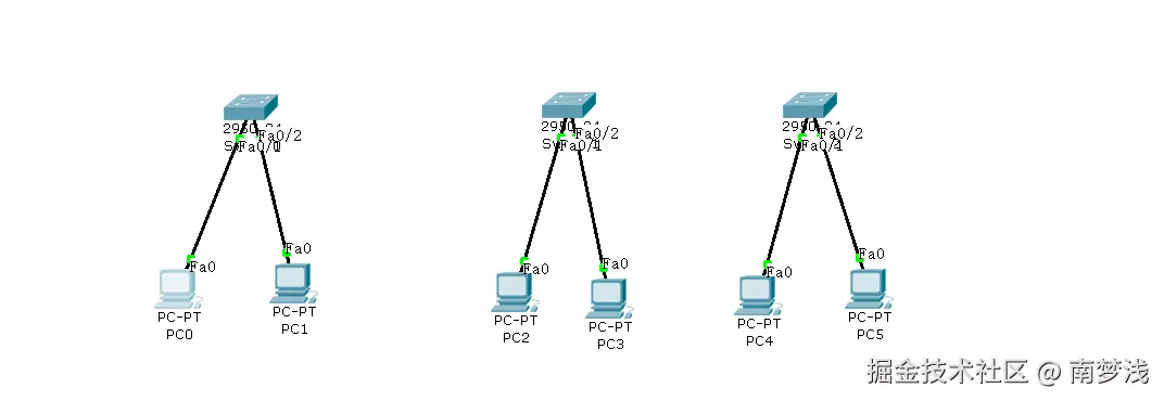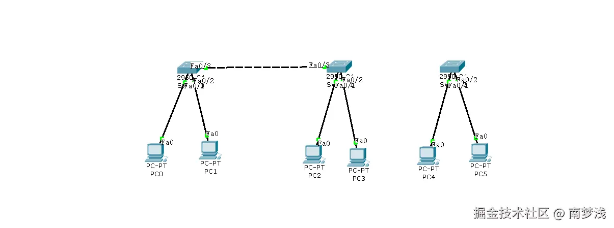 编辑三台交换机,六个PC,简单来说就是三个二层结构,如果要转三层需要路由器,这个后面我会继续写。