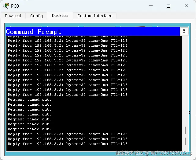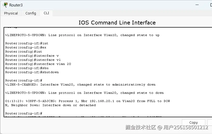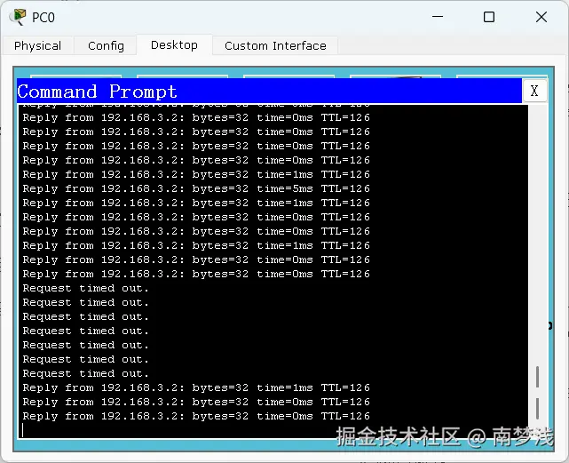 关闭VLAN 20接口,然后你会发现会丢失一段时间的包,但是过一会网络即可继续传输如下图