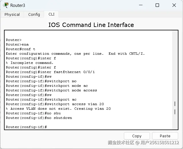 用的插件是HWIC-4ESW这是个二层接口所以是配置不了IP所以我直接先划分的VLAN然后给VLAN配的IP