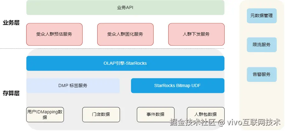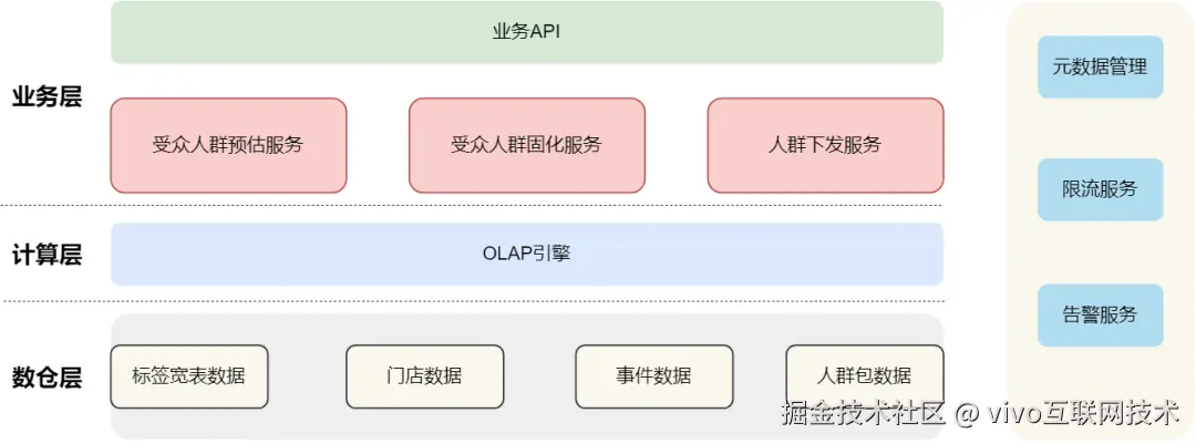 - **业务层:**提供人群受众筛选、受众人群固化、渠道人群下发逻辑业务处理能力;对外主要提供受众筛选-标签+事件+人群的预估能力。