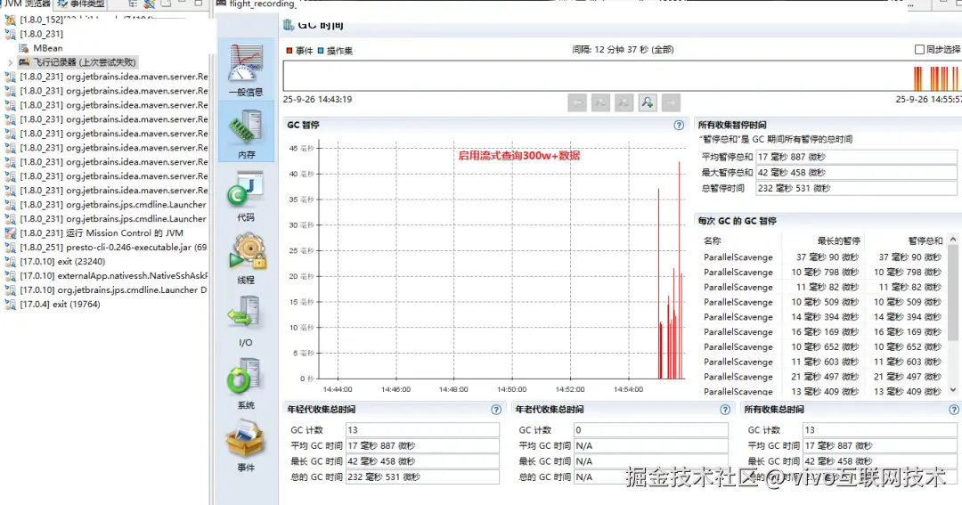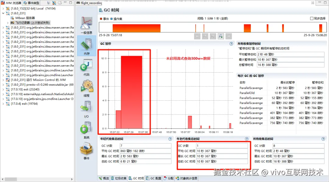 - 在本地环境中,通过调整PreparedStatement的fetchSize参数进行对比测试,复现了线上服务GC暂停现象:当未启用流式查询时,GC暂停时间长达10s。
