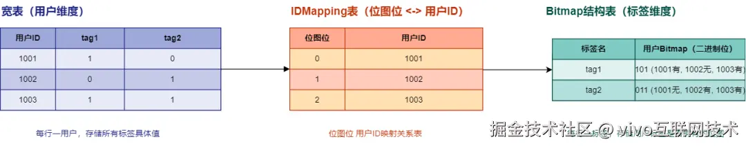 为解决以上问题点,通过与大数据、DMP团队合作优化底层标签数据结构,采用Bitmap数据结构设计标签优化底层数据源。