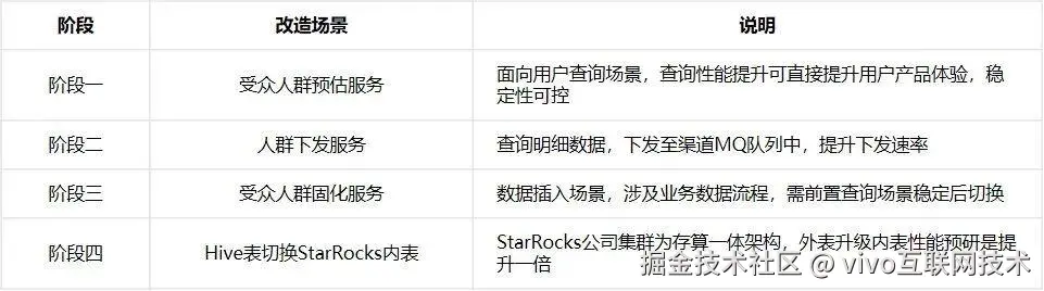 将切换StarRocks需要改造的点都准备完成后,我们将遵循“由简到繁、由读到写、分阶段推进”的原则,分为四个阶段改造业务系统,控制切换风险及平滑过渡: