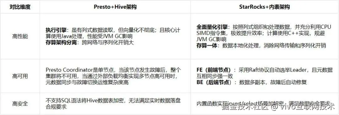 为体现切换StarRocks的升级价值,从高性能、高可用、高安全维度进行对比。
