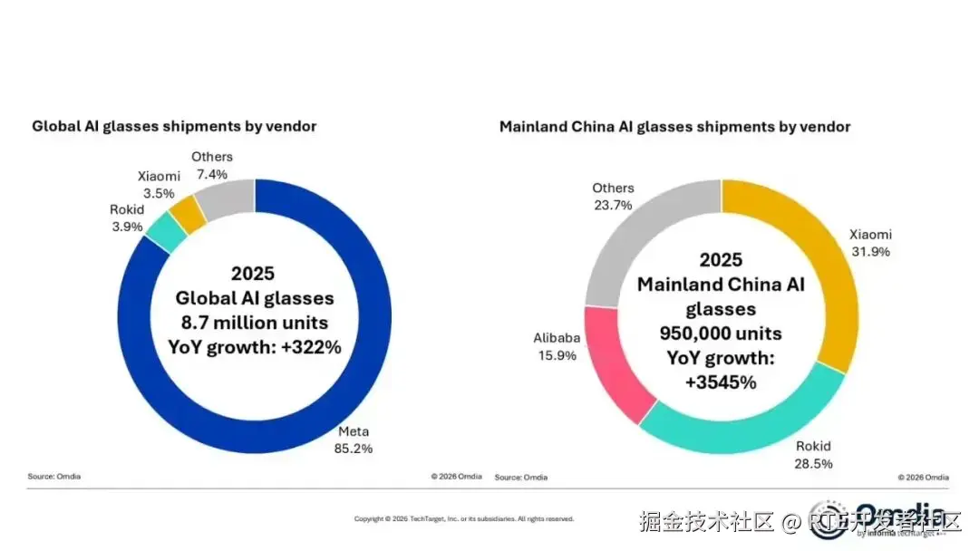 近日,全球知名科技市场研究机构 Omdia 发布最新数据:2025 年全球 AI 眼镜出货量达870 万台,同比增长322% 其中,尽管 Meta 以 85.2%的份额继续统治「无显示」AI 眼镜市场,但在一个更关键的细分赛道——「带显示的 AI+AR 眼镜」中,中国厂商却悄然完成了反超,市场占比高达 71%。