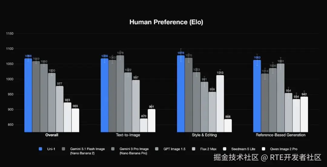 根据官方提供的数据,Uni-1 在 RISEBench 推理基准测试中达到了最先进(SOTA)水平,并在人类偏好 Elo 评测中的总评、风格与编辑以及参考生成类别中排名第一。