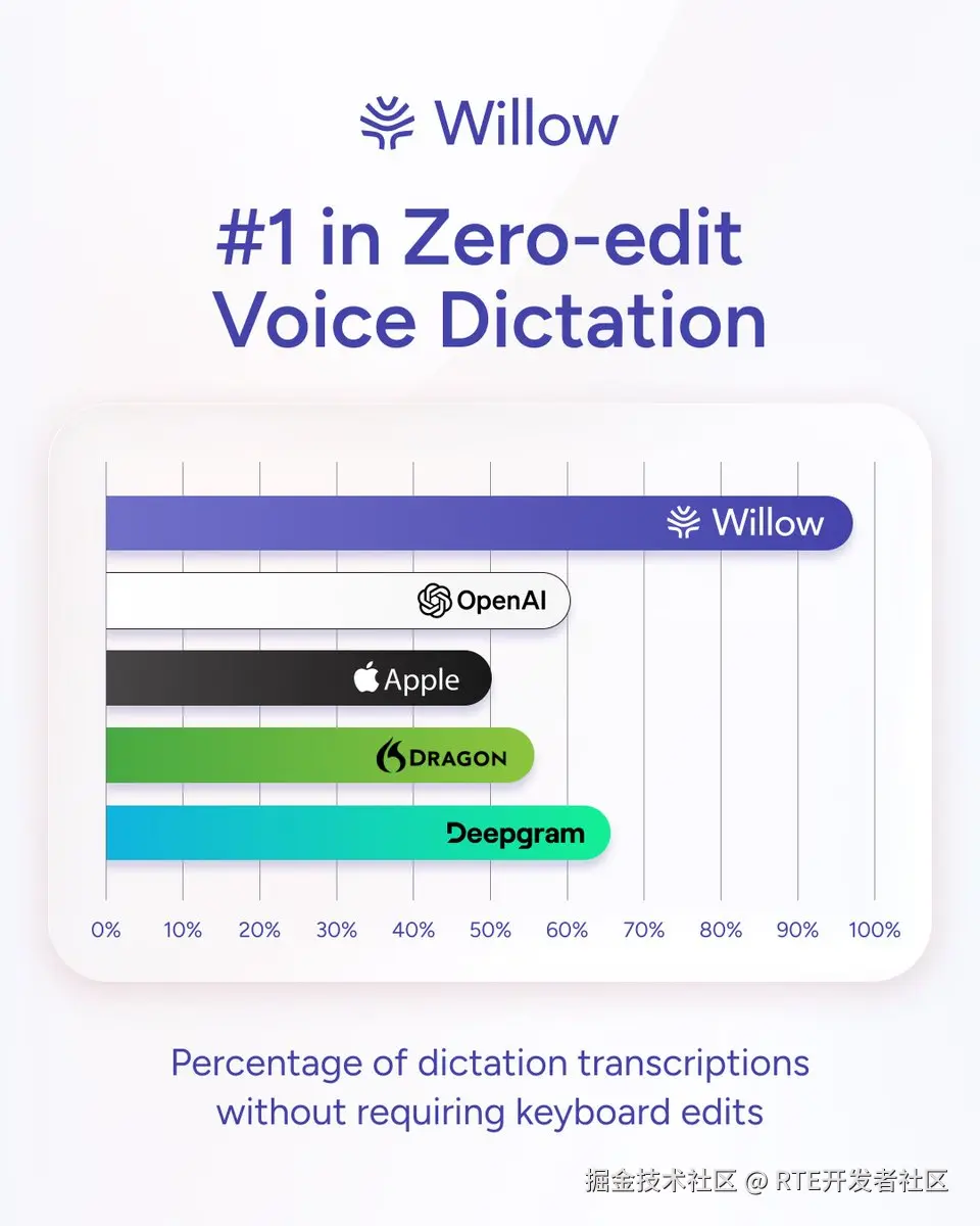 语音 AI 初创公司 Willow 今日宣布其最新一代模型取得重大突破。测试数据显示,该模型在零编辑语音听写(Zero-edit Voice Dictation)性能上表现强劲,识别准确度达到 OpenAI、Apple、Dragon 及 Deepgram 等主流竞品的 2 倍。