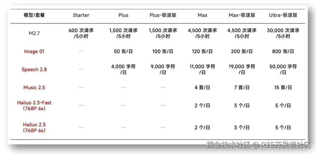 对于有批量生产需求的专业开发者和企业用户,MiniMax 还推出**「语音资源包」与「视频资源包」增购选项**,支持旗舰语音模型 Speech 2.8 及视频模型 Hailuo 2.3 / 2.3-Fast,官方称相较单独调用可节省最多 20% 的使用成本。