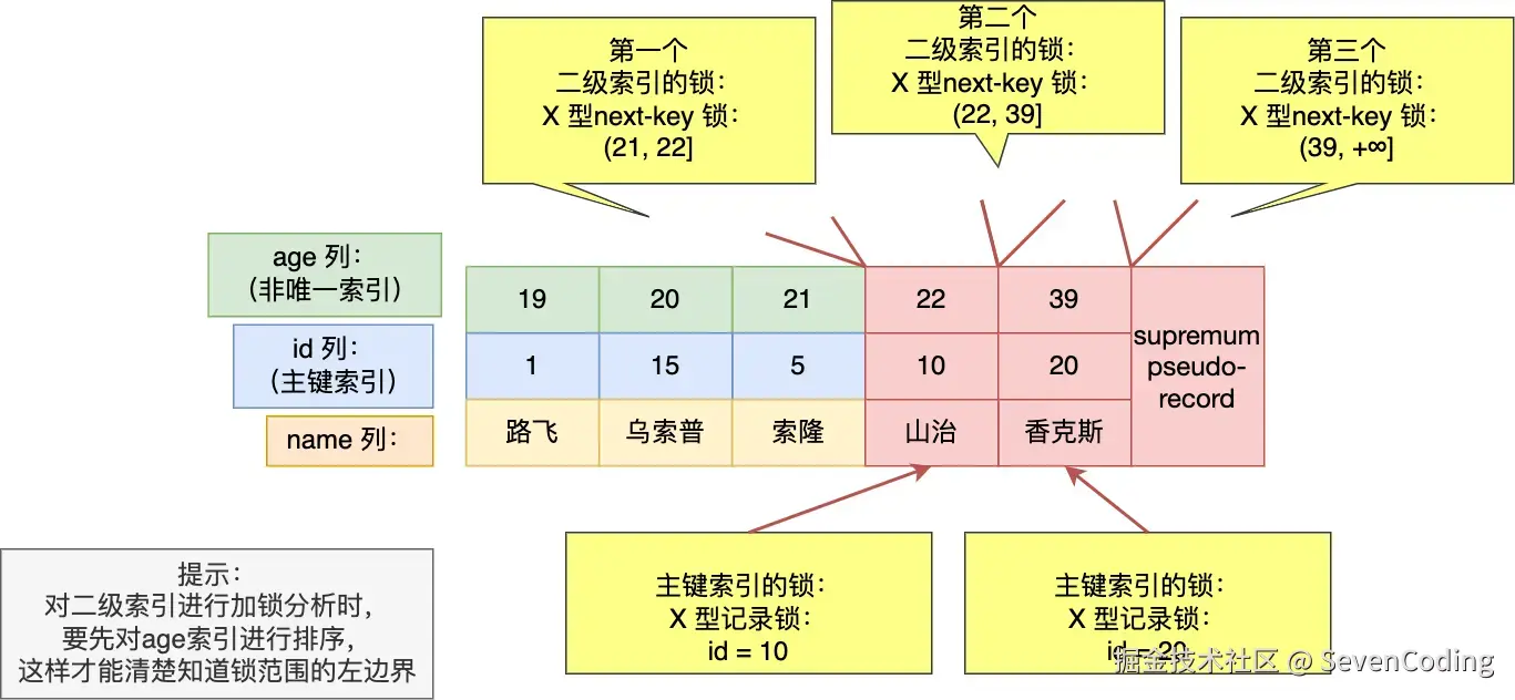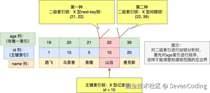 - 在 age = 22 这条记录的二级索引上,加了范围为 (21, 22] 的 next-key 锁,意味着其他事务无法更新或者删除 age = 22 的这一些新记录,不过对于是否可以插入 age = 21 和 age = 22 的新记录,还需要看新记录的 id 值,与前面一致,不再赘述。