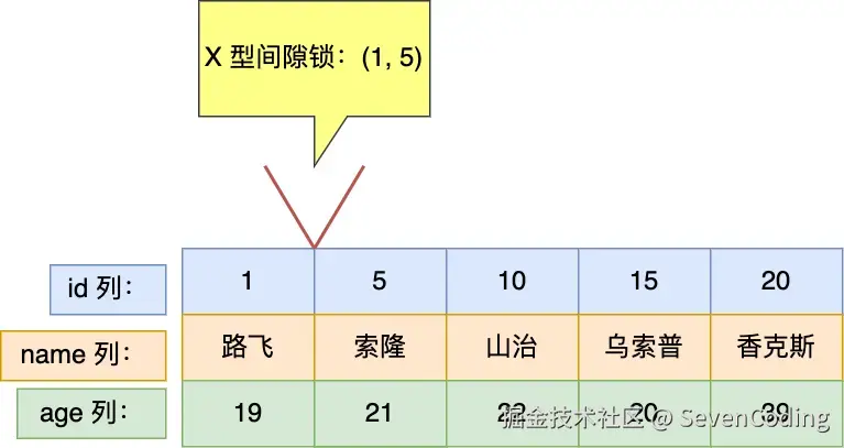 假设这个表,id 是主键索引(唯一索引),age 是普通索引(非唯一索引),name 是普通的列。数据如下: