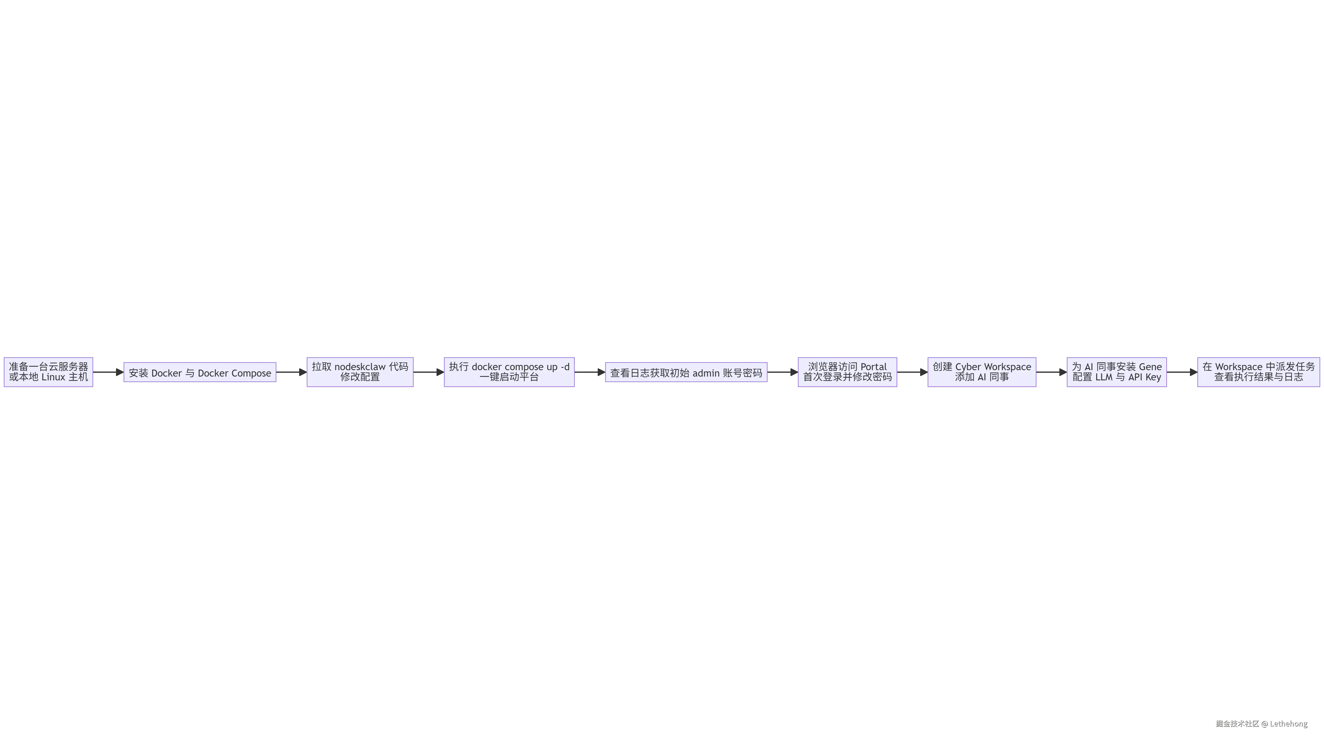 下面这张流程图,是从“准备服务器”到“AI 同事真正干活”的完整链路: