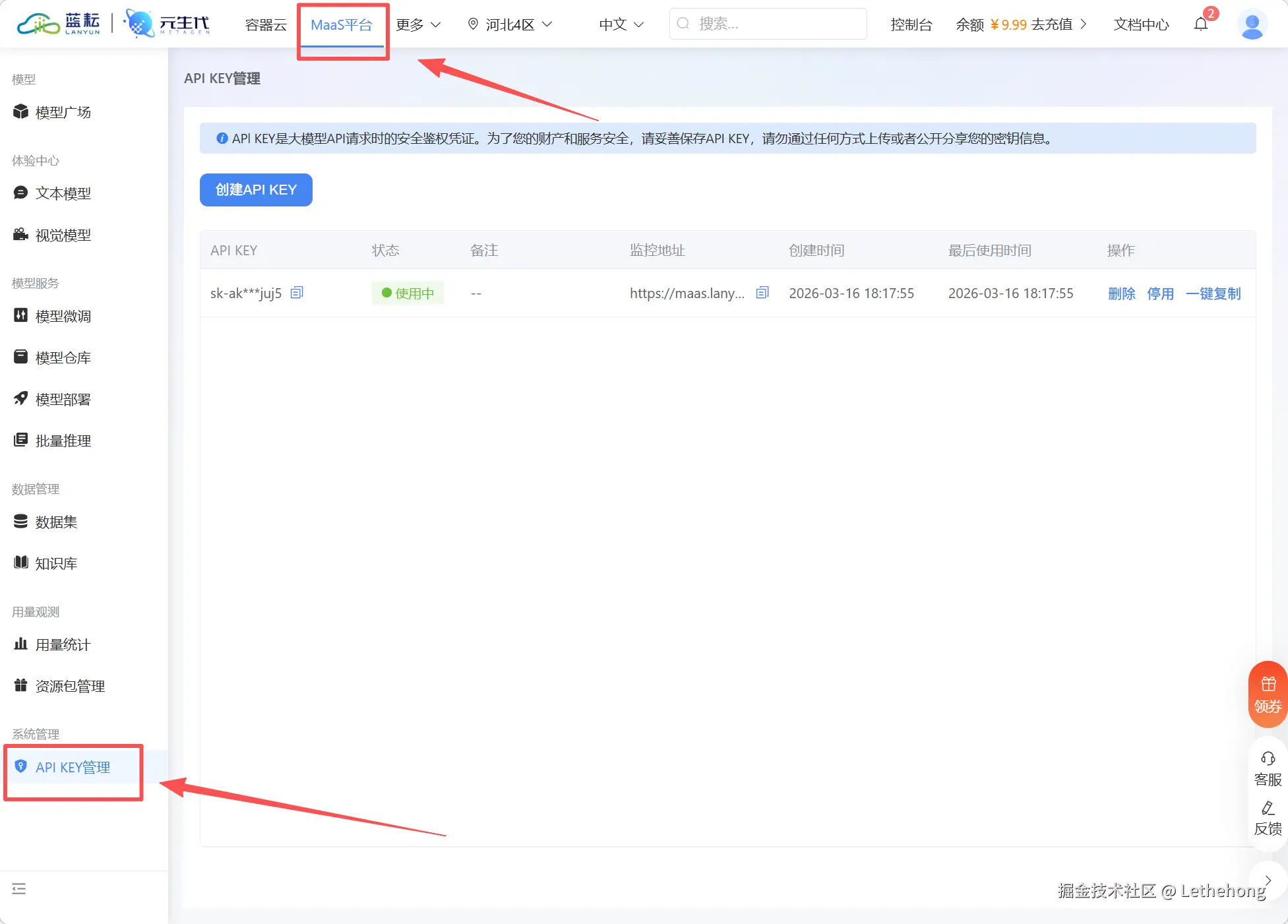 我这里使用蓝耘MaaS模型/maas/jieyue/step-3.5-flash,登录之后跟随图片中的步骤一步一步获取api
