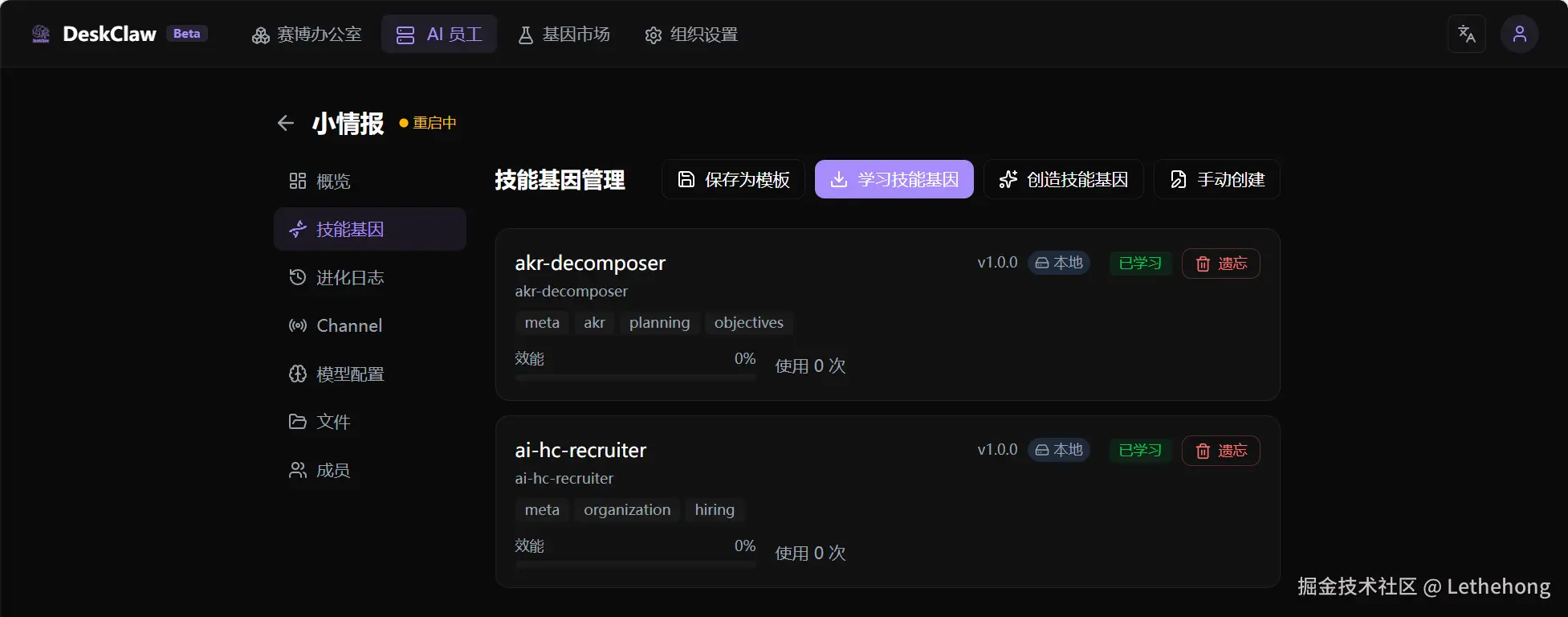 具体界面名称可能为“基因库 / GeneHub”或“技能市场”,但逻辑是一致的:从市场安装 Gene,再分配给 AI 同事。