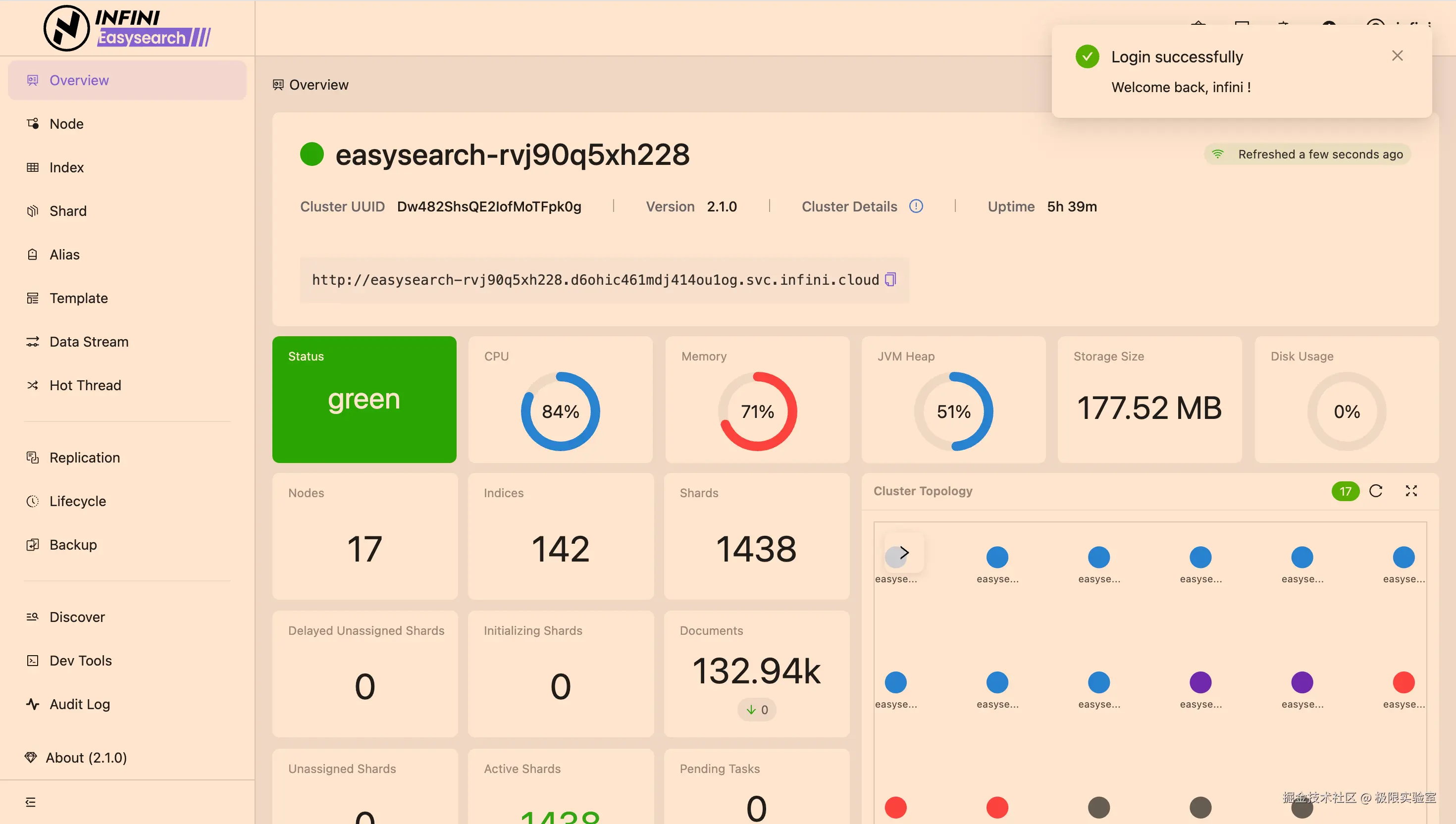 INFINI Console 是一款开源的非常轻量级的多集群、跨版本的搜索基础设施统一管控平台。通过对流行的搜索引擎基础设施进行跨版本、多集群的集中纳管,企业可以快速方便的统一管理企业内部的不同版本的多套搜索集群。